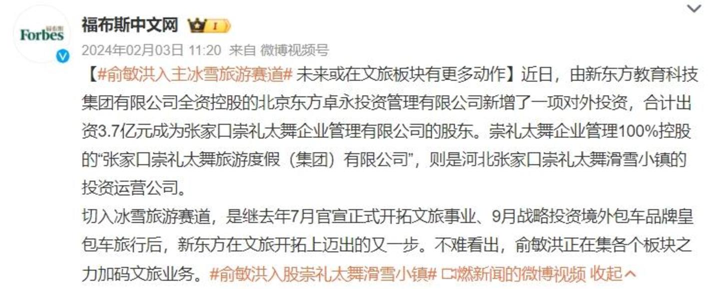 也有跨界而来的“巨头”们。2024年初俞敏洪就豪掷3.7亿投资了崇礼太舞滑雪小镇,把冰雪旅游纳入了新东方的文旅版图。