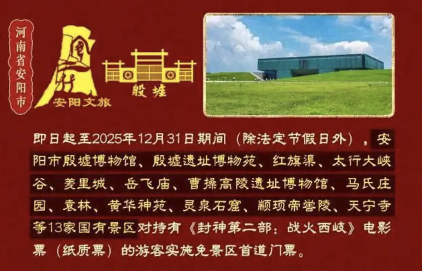 由此来看,降低消费者的综合观影成本是让观众重新走进电影院的一个思路。例如推出综合折扣更低的会员卡,联动餐饮品牌推出观影折扣券,又或者是联合线上平台补贴推出特别时段的观影券。而《封神2》在上映期间,就联动安阳市殷墟博物馆、殷墟遗址博物苑、红旗渠等13家国有景区,推出持电影票根免景区首道门票的活动。