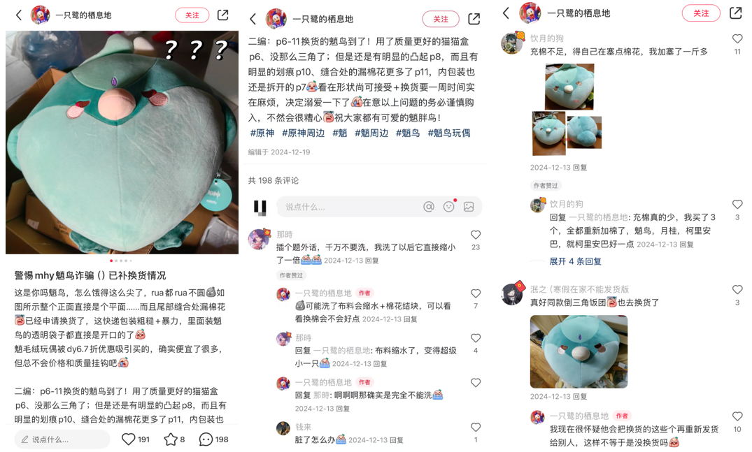 被玩家质疑品控的不止黑神话,《原神》衍生品亦有类似情况。比如2024年12月,有不少小红书用户发布笔记,称自己在官方旗舰店购买的魈鸟玩偶品控很差,评论区也有相当数量用户响应。用户们普遍反映的问题是原本玩偶应该呈饱满圆形,到手却“圆脸变尖脸”,形态不对,充棉量不足,有的走线处还露出了线头。