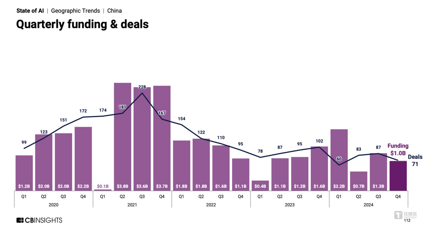 然而,CB Insights认为,尽管中国的DeepSeek颠覆了人们对强大 AI 模型技术的看法,但是,2024年,中国 AI 初创企业筹集的资金仅52亿美元,占美国 AI 初创企业筹集资金763亿美元的7%,中国 AI 投资热潮远低于美国。