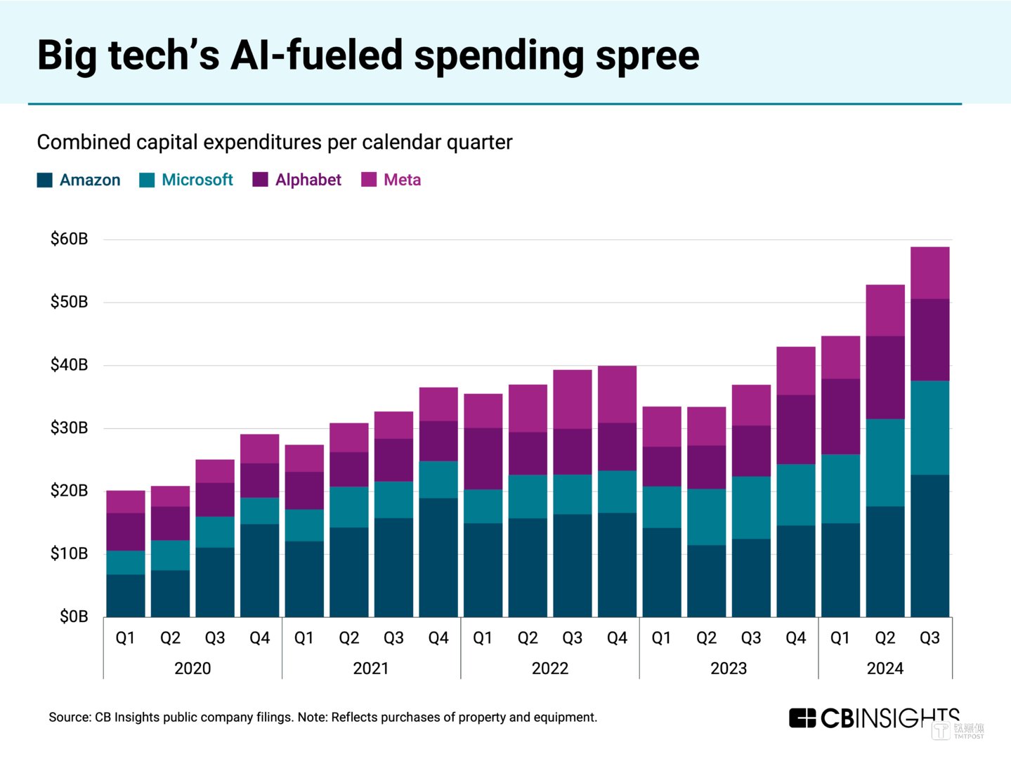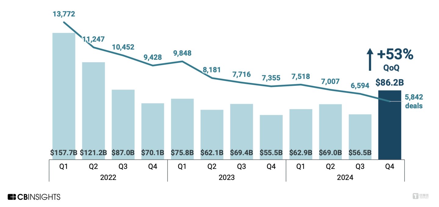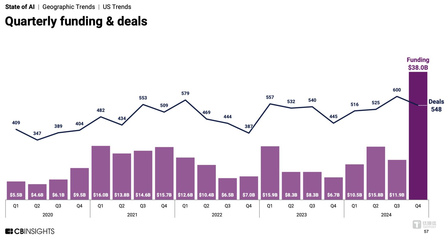 按季度计算,2024年第四季度,全球 AI 投融资额增至创纪录的 438 亿美元,环比增长2.5倍以上,其中巨额融资轮次占融资总额的比重高达80%。
