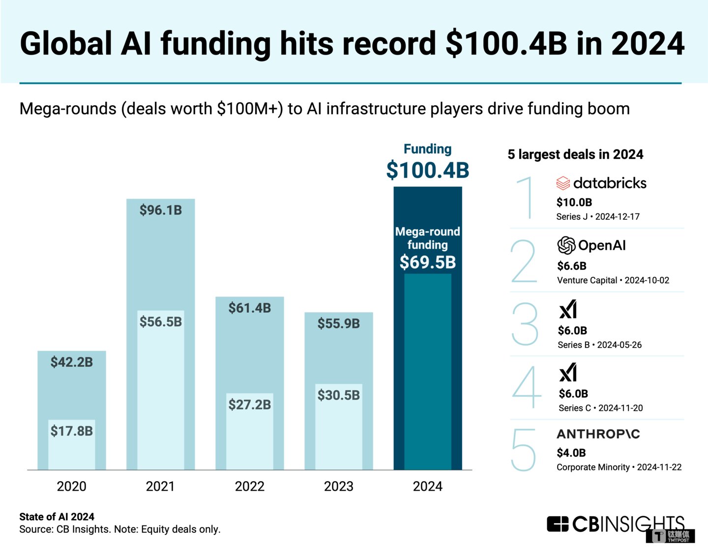 然而,AI 行业依然大热,OpenAI、xAI等公司开始引领全球 AI 融资热潮。过去的2024年,全球 AI 领域融资总额高达1004亿美元,其中695亿美元来自单轮巨额融资(交易价值 1 亿美元以上)。