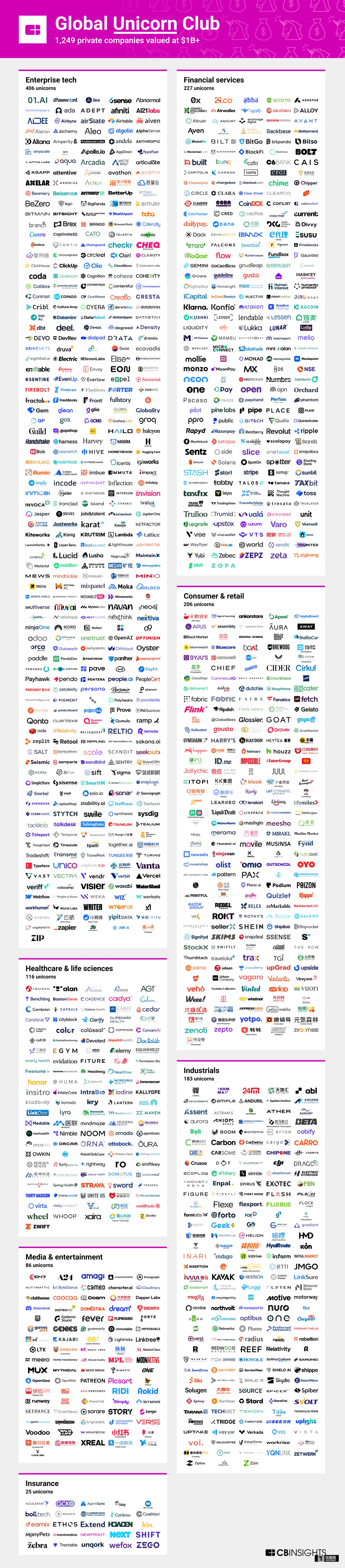 其中,总部位于中国的独角兽公司共有162家左右,包括估值3000亿美元的字节跳动、170亿美元的小红书、150亿美元的大疆创新(DJI),以及 AI 公司智谱(30亿美元)、月之暗面(Moonshot AI,33亿美元)、百川智能(27.7亿美元)、壁仞科技(23.2亿美元)、旷视(40亿美元)、依图(21.7亿美元)、云知声(13.1亿美元)等。