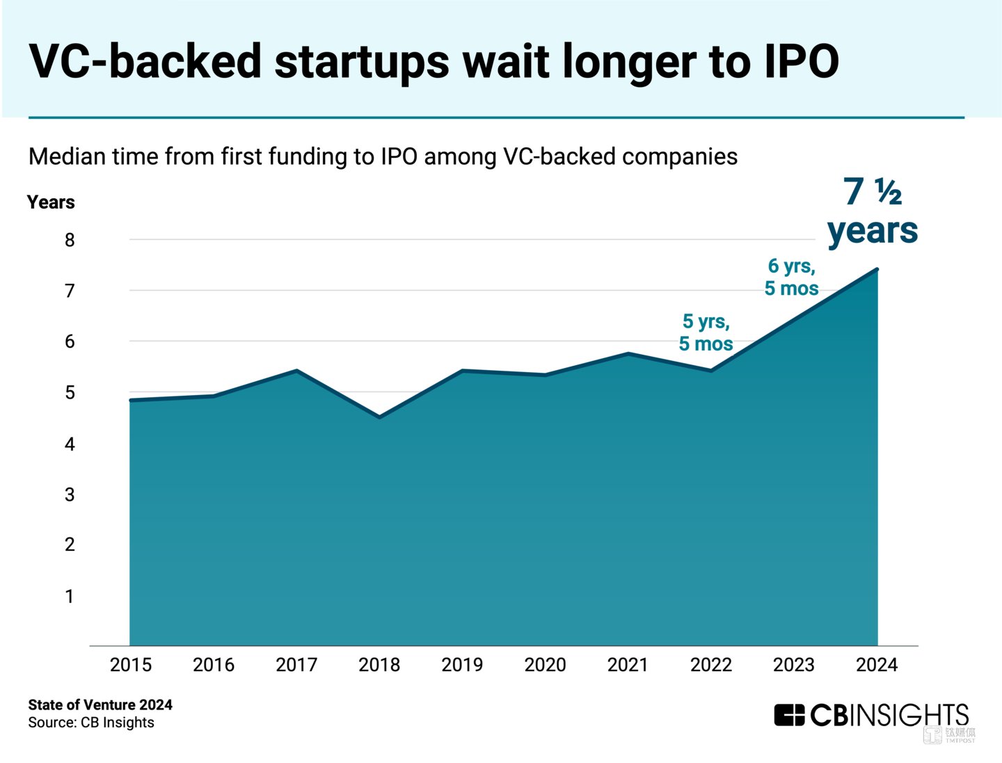 数据显示,2024 年全球科技公司首次公开募股(IPO)的等待时间达到了7.5年,相较于2022年增加了2年。因此,Stripe、Databricks等公司通过筹集额外股权资金或出售私募股份来代替上市,从而为早期投资者和员工创造流动性。