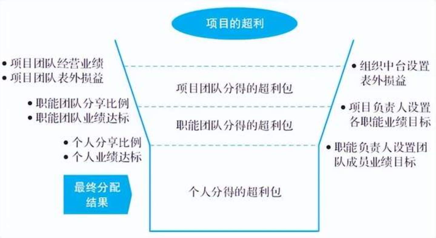 具体来说,包括三层:一是基于项目的超利,项目团队与公司进行分利;二是基于项目团队分得的超利包,项目内的职能团队与职能团队之间进行分利;三是基于职能团队分得的超利包,职能团队内的个人与个人之间进行分利。