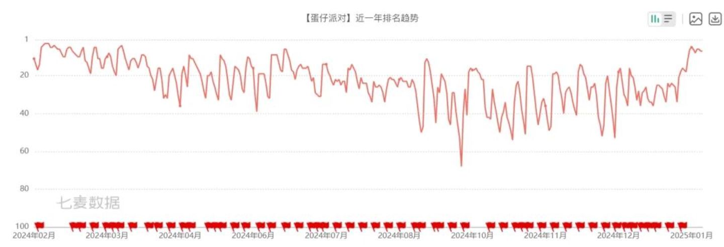 在“王者、吃鸡、金铲铲”三足鼎立的春节档,还有几款老牌游戏趁节日的风口实现了一波强势回温。比如去年春节期间的现象级作品《蛋仔派对》,出于种种原因,它曾在2024的后半年表现低迷,一直处在畅销榜的三十名左右。而在1月22日到1月29日的这一周,《蛋仔派对》却从三十多名一鼓作气回到了前十的位置,并在后续春节期间维持在Top10直到今日,作为主打合家欢的派对游戏,《蛋仔派对》的趁势增长算是情理之中。