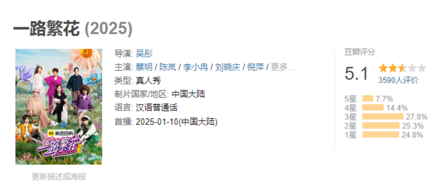 原本靠选角成功一半的《一路繁花》中途哑火,节目最大的记忆点依旧是嘉宾互撕,又回归了“花学”的扯头花,属实是有点浪费嘉宾了。