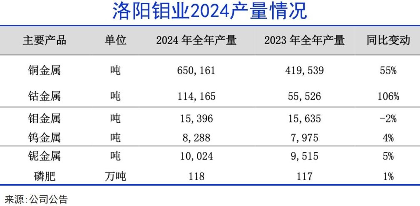 洛阳钼业也在新兴资源领域大展拳脚。2023年反超嘉能可成为全球最大钴矿生产商后,去年该公司产钴11.4万吨,同比增长106%;产铜约65万吨,铌金属产量首破万吨,达到10024吨,同比增长了5%。