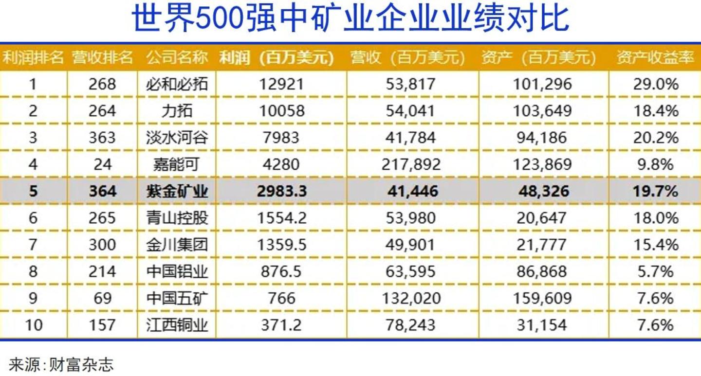 尤其是近年来铜金等资源走入大牛市,行情推动相关企业业绩大增,紫金矿业、洛阳钼业都在顺周期里暴赚,2024年中铝或将创历史最佳业绩。其中,紫金矿业盈利能力和资产效率,已经开始逼近甚至反超那些曾经让其仰望的世界选手。