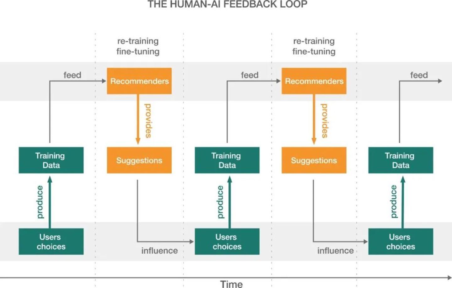 所有这些系统中都存在一个共同点,那就是“反馈循环”。而这正是人机协同进化的核心。以推荐系统为例,我们可以将反馈循环描述为:用户的决策决定了推荐系统训练的数据集;经过训练的推荐系统随后影响用户的后续选择,这反过来又影响下一轮的训练,从而形成一个可能永无止境的循环(图2)。