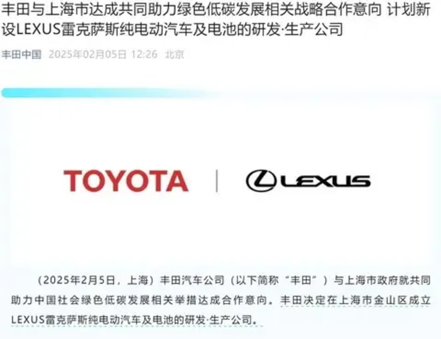 2025年2月5日,丰田官方宣布,旗下豪华品牌雷克萨斯将在上海独资建厂。