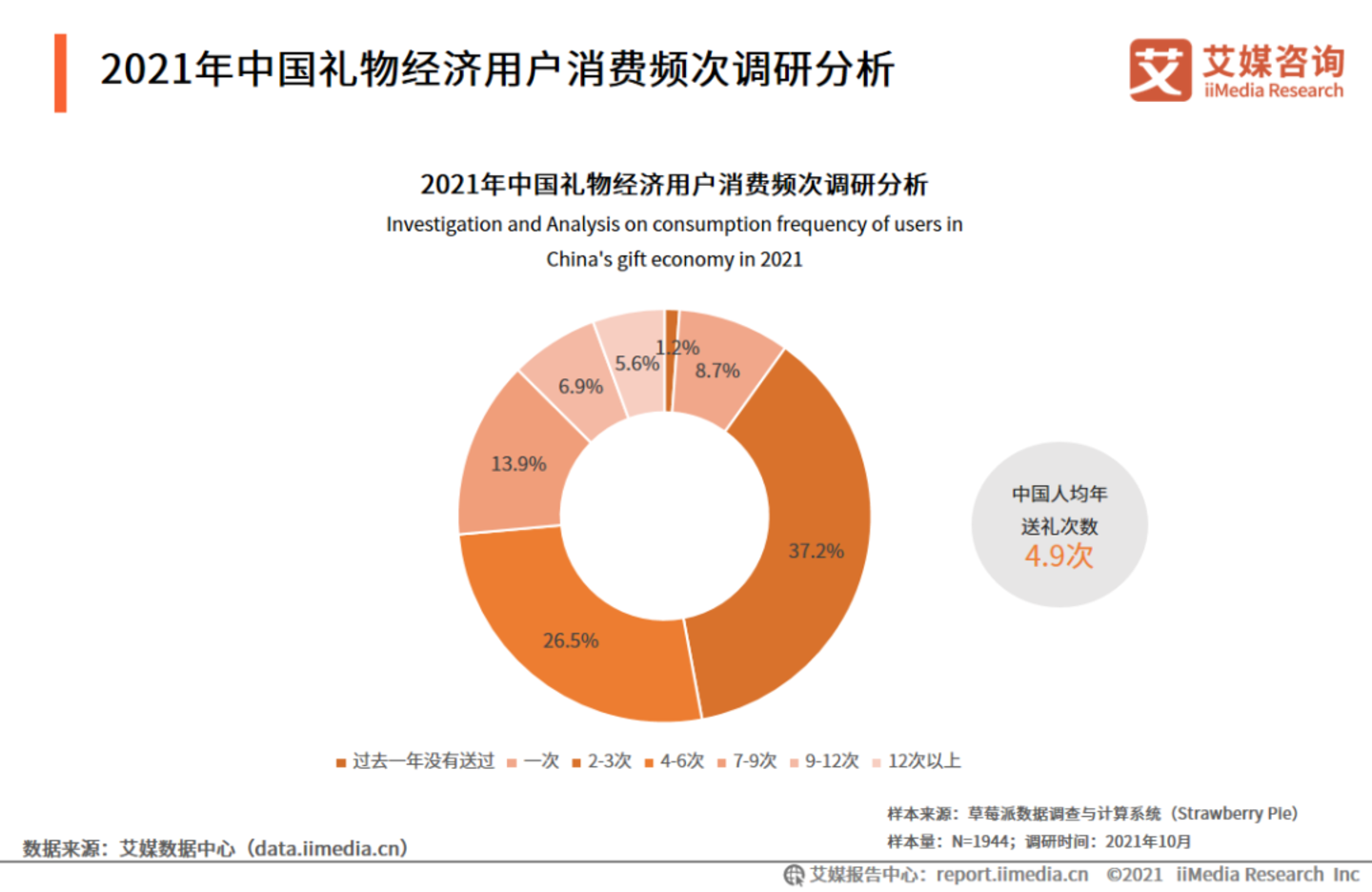 且相比购物的高频,人均送礼消费频次就更低了。艾媒咨询数据显示,中国礼物经济用户过去一年送礼频率集中在2-6次(63.7%)。