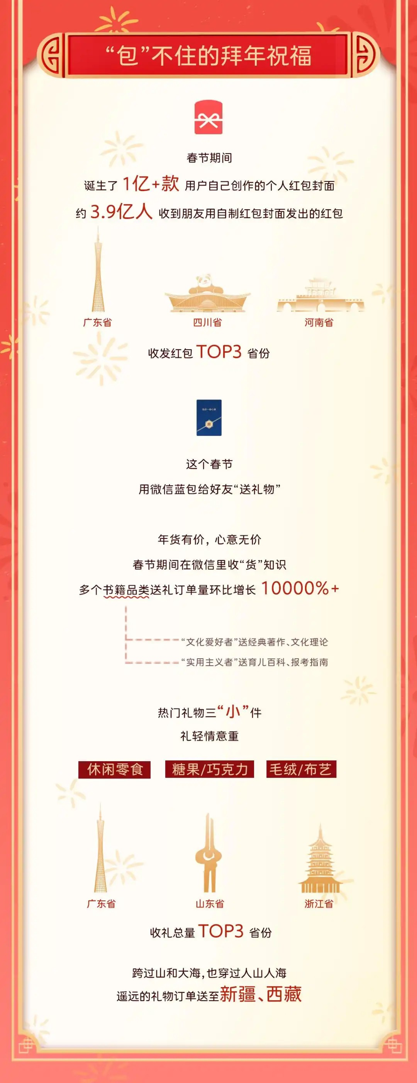 2月5日,微信发布了《2025春节数据报告》,其中就有涉及到“送礼物”的相关数据。该报告透露,(平台)收到礼物数目最多的省份前三甲是广东省、山东省、浙江省,而较远的新疆维吾尔自治区、西藏自治区等,也都有人收到“蓝包”祝福。