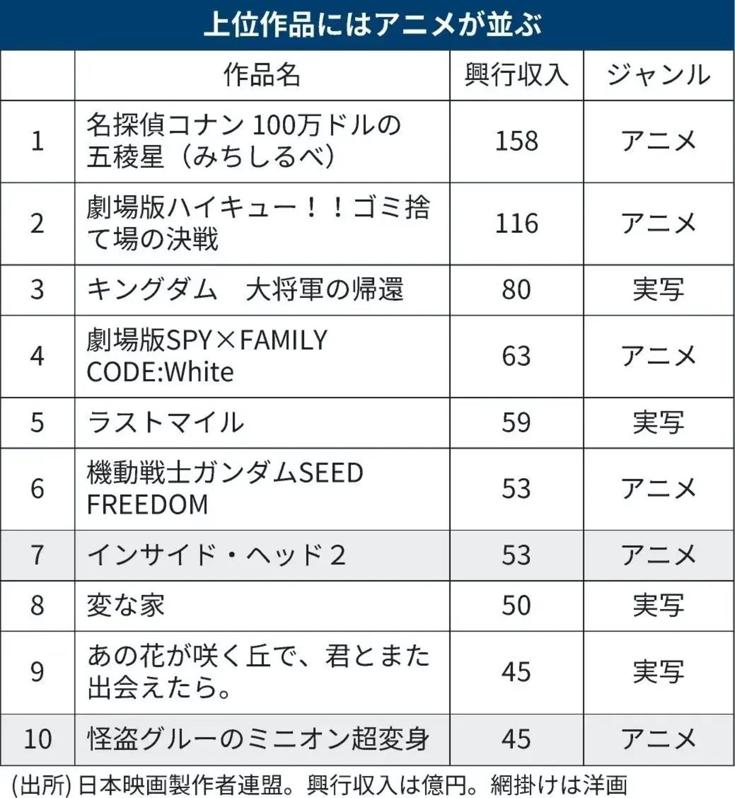 1月29日,日本映画制作者联盟公布了年度数据。