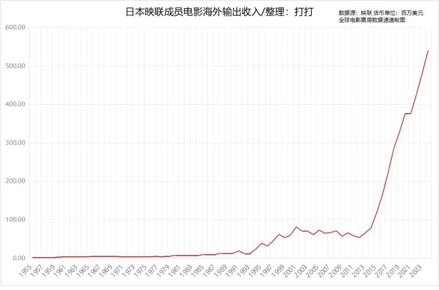 本土电影的成绩再度刷新纪录,但进口片的发行数和总票房双双下滑,拖累日本大盘录得6.5%的同比跌幅。不过,在海外发行上,日本电影成绩首次突破5亿美元,已实现超过十年的稳健成长,成为亚洲国家“文化输出”的优等生。