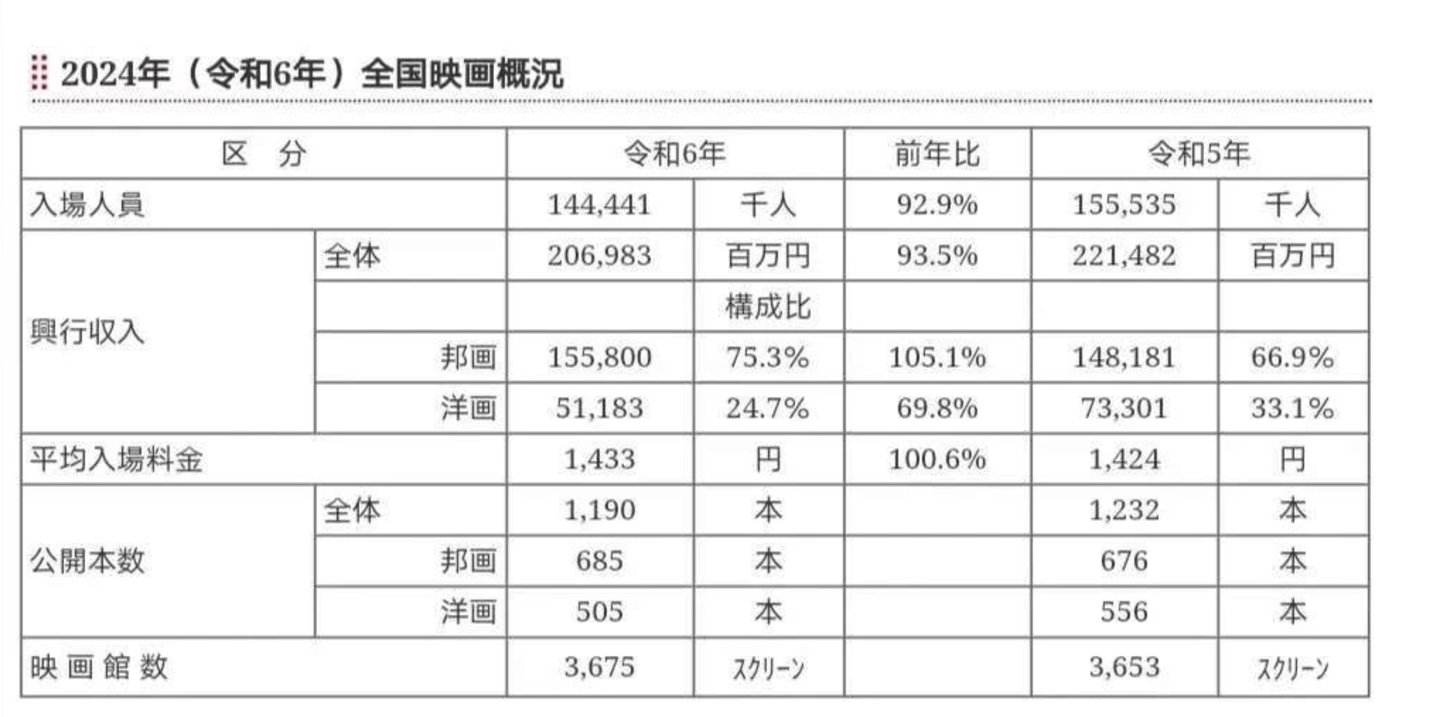 另外,2024年日本总观影人次下滑7.1%至1.44亿,平均票价则创下1433日元的新高,可见线下业态面临的通胀压力。