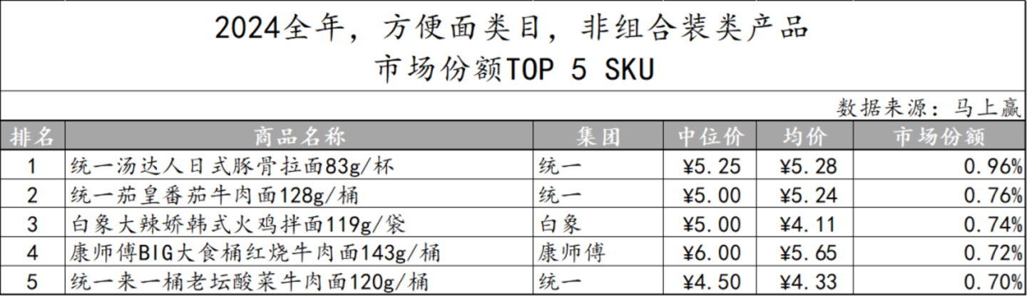 基于2024全年方便面类目的市场份额TOP SKU情况可以看到,在组合装产品中,有三款产品均来自白象集团,分别隶属于汤好喝与大辣娇两个品牌,其影响力不容小觑。除此以外,统一、康师傅也各有一个SKU上榜。