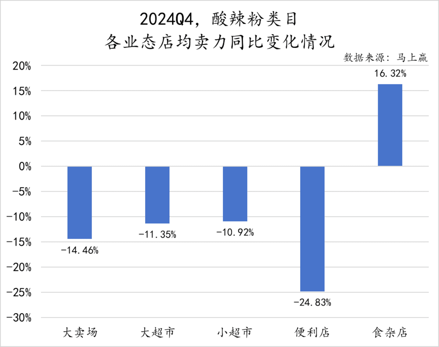 2024年第四季度,酸辣粉类目在各业态的店均卖力表现呈现出较为明显的分化。其中食杂店店均卖力同比增长16.32%,而便利店则出现店均卖力同比-24.83%的显著下滑。此外,大卖场、大超市和小超市的店均卖力也出现不同程度的同比下降。