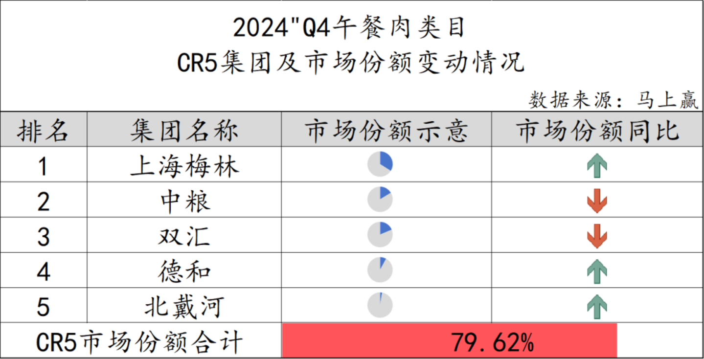 午餐肉类目的品牌集中度相对较高,五大头部集团共占据了79.62%的市场份额。上海梅林、德和和北戴河三个集团的市场份额相比去年同期有所增长,而中粮和双汇则出现市场份额同比下滑。