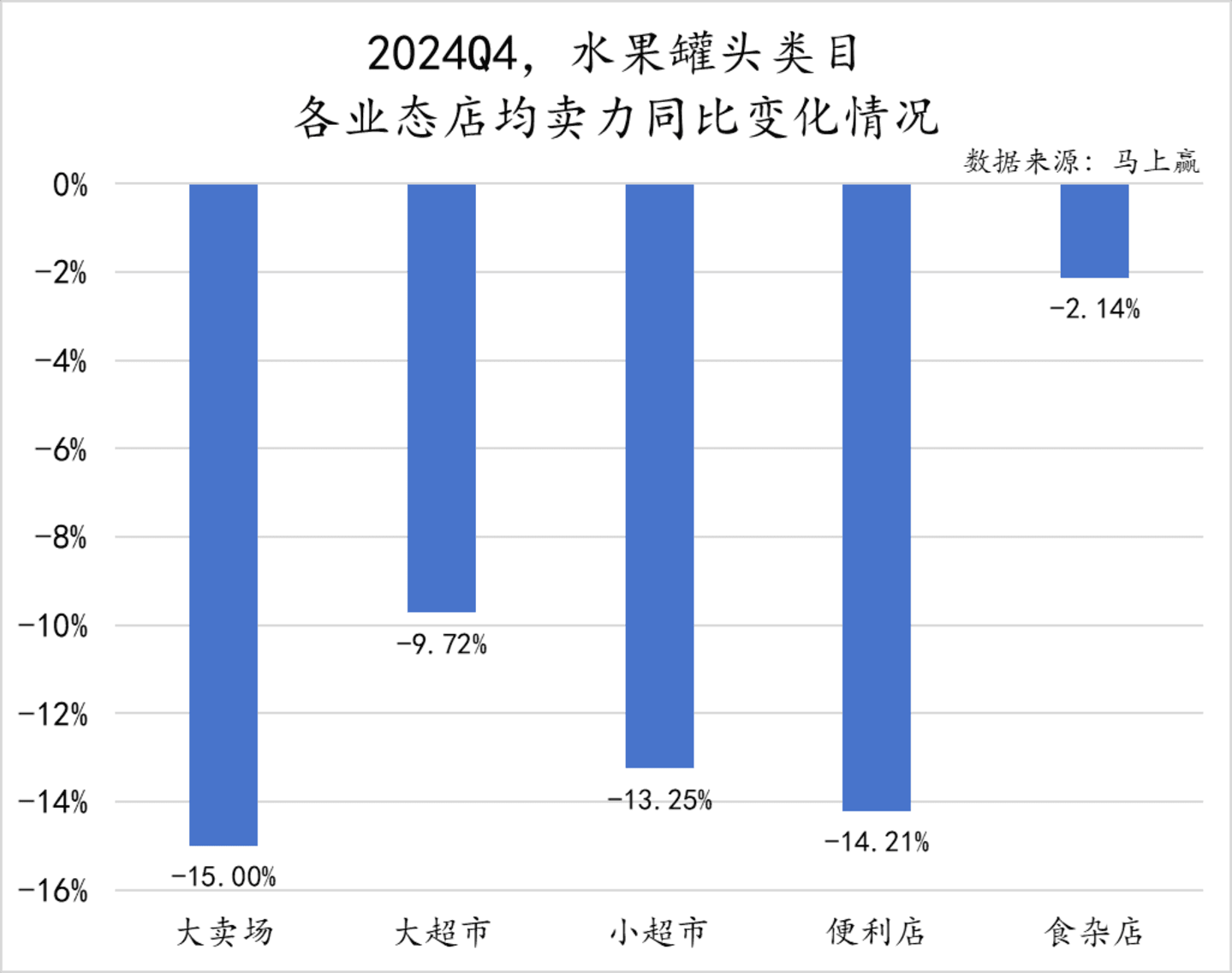 水果罐头类目在各业态中的店均卖力同比变化上,可以看到,各业态店店均卖力均呈现下滑趋势。其中,食杂店的同比变化最小,较其他业态店相比更加稳定。而大卖场、大超市、小超市和便利店均出现较大幅度的下滑。