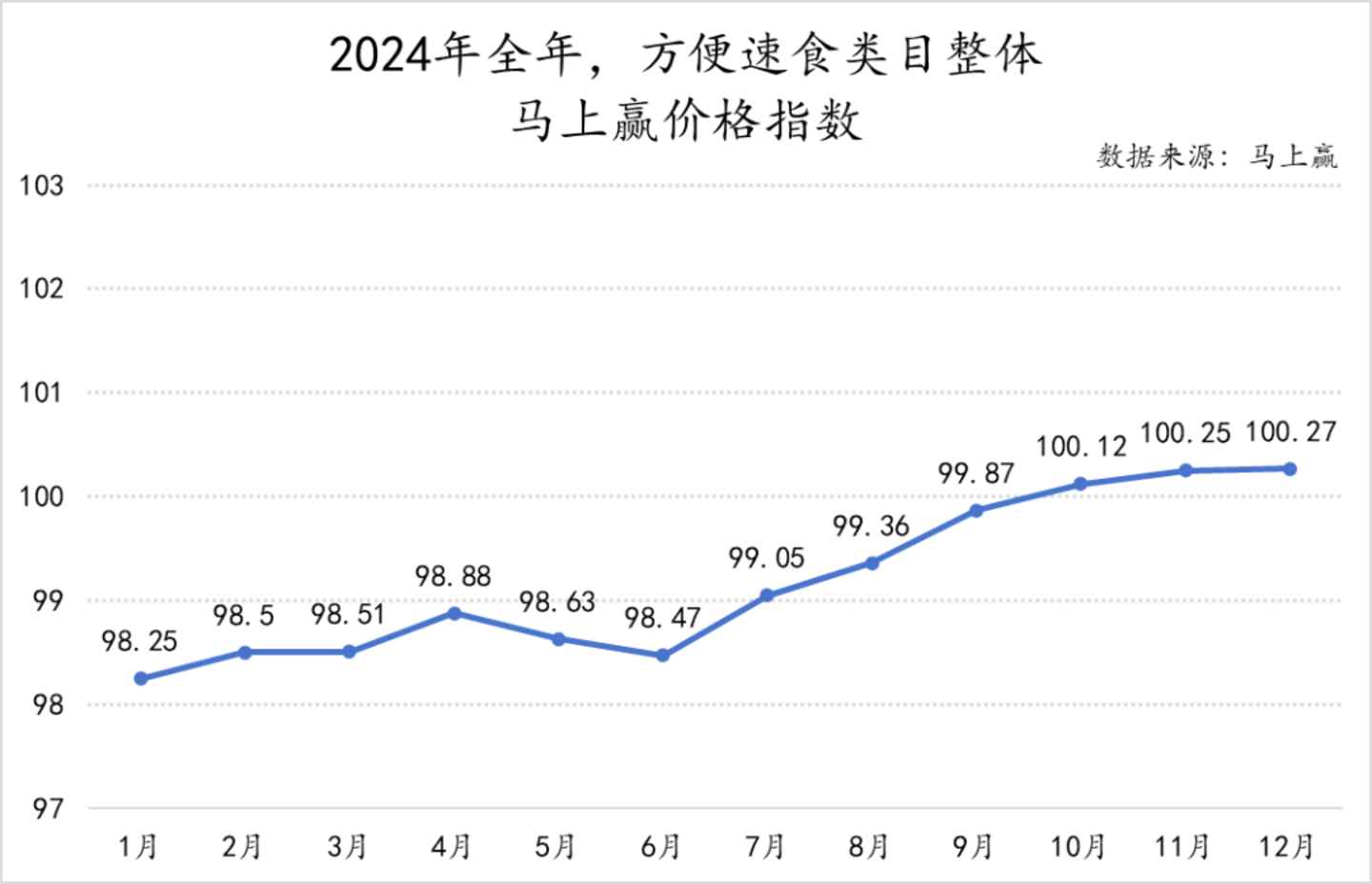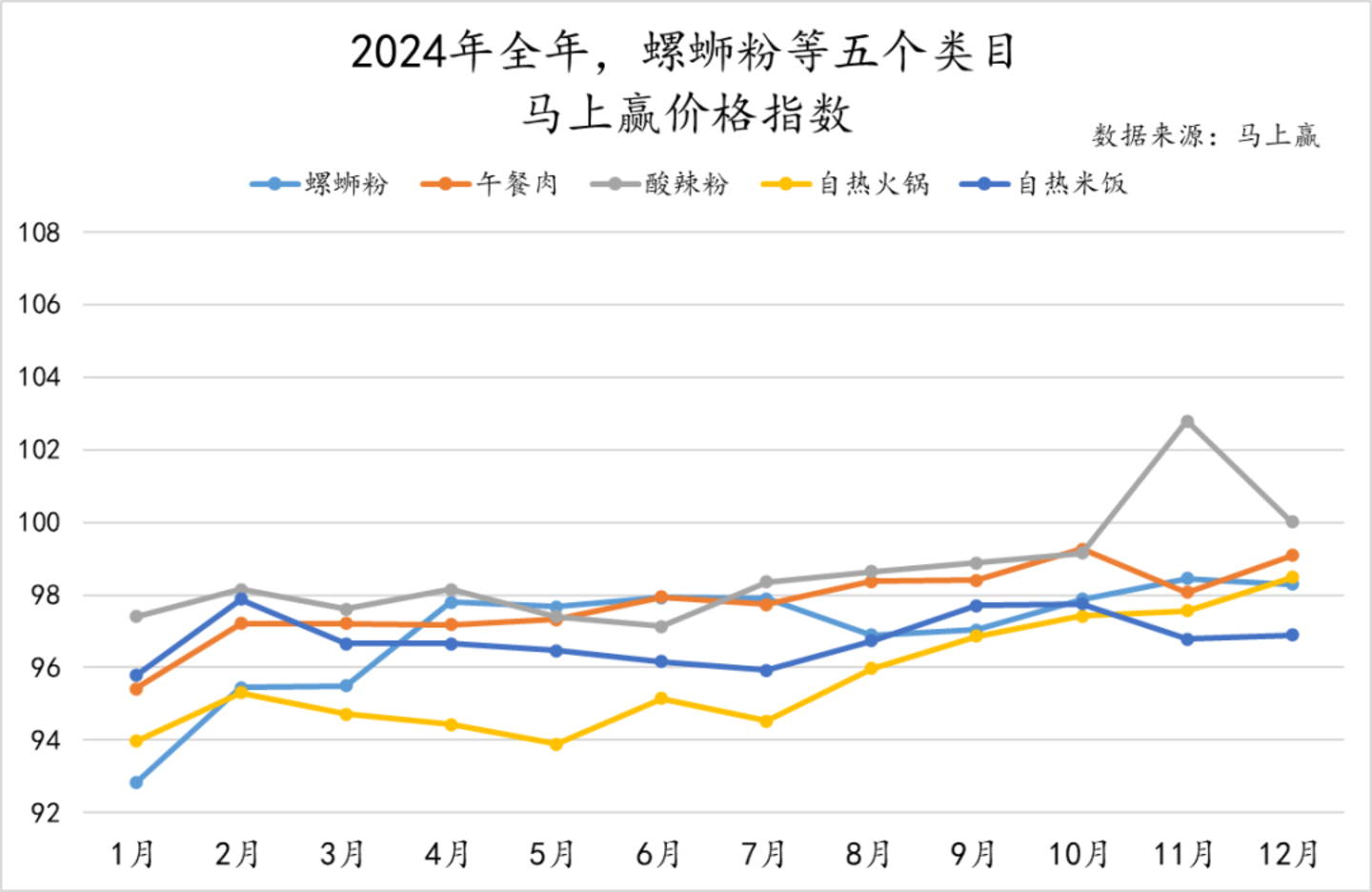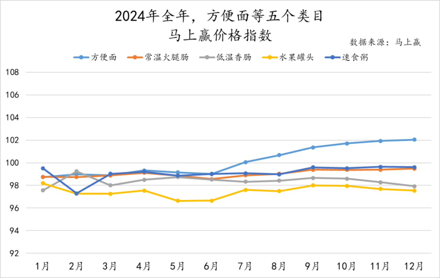为了更好地分析方便速食类目整体价格持续变动和走势,我们梳理了该类目2024年全年的马上赢价格指数。该指标以100为基准值,其数值上下波动为类目的价格指数与去年同期价格指数的相对百分比,100表示与去年同月持平,高于100表示同比价格指数上升,低于100则表示同比价格下降。