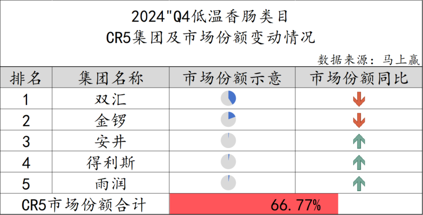 低温香肠类目中,CR5集团的市场份额合计66.77%,相比起来集中度不算高。同时,双汇和金锣两大集团虽然市场份额占比较高,但市场份额均呈现同比下降趋势,而占比较小的安井、得利斯和雨润的市场份额同比均有所上升,可见低温香肠市场中各集团之间的竞争逐渐激烈。