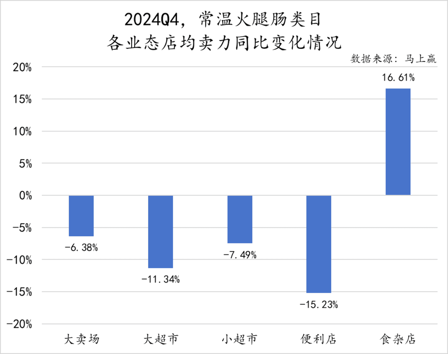 2024Q4午餐肉类目的店均卖力同比变化情况中,食杂店的店均卖力同比增长11.49%,表现最为突出,大卖场也实现了1.54%的同比正向增长。而大超市、小超市和便利店的店均卖力则出现了不同程度的下降。