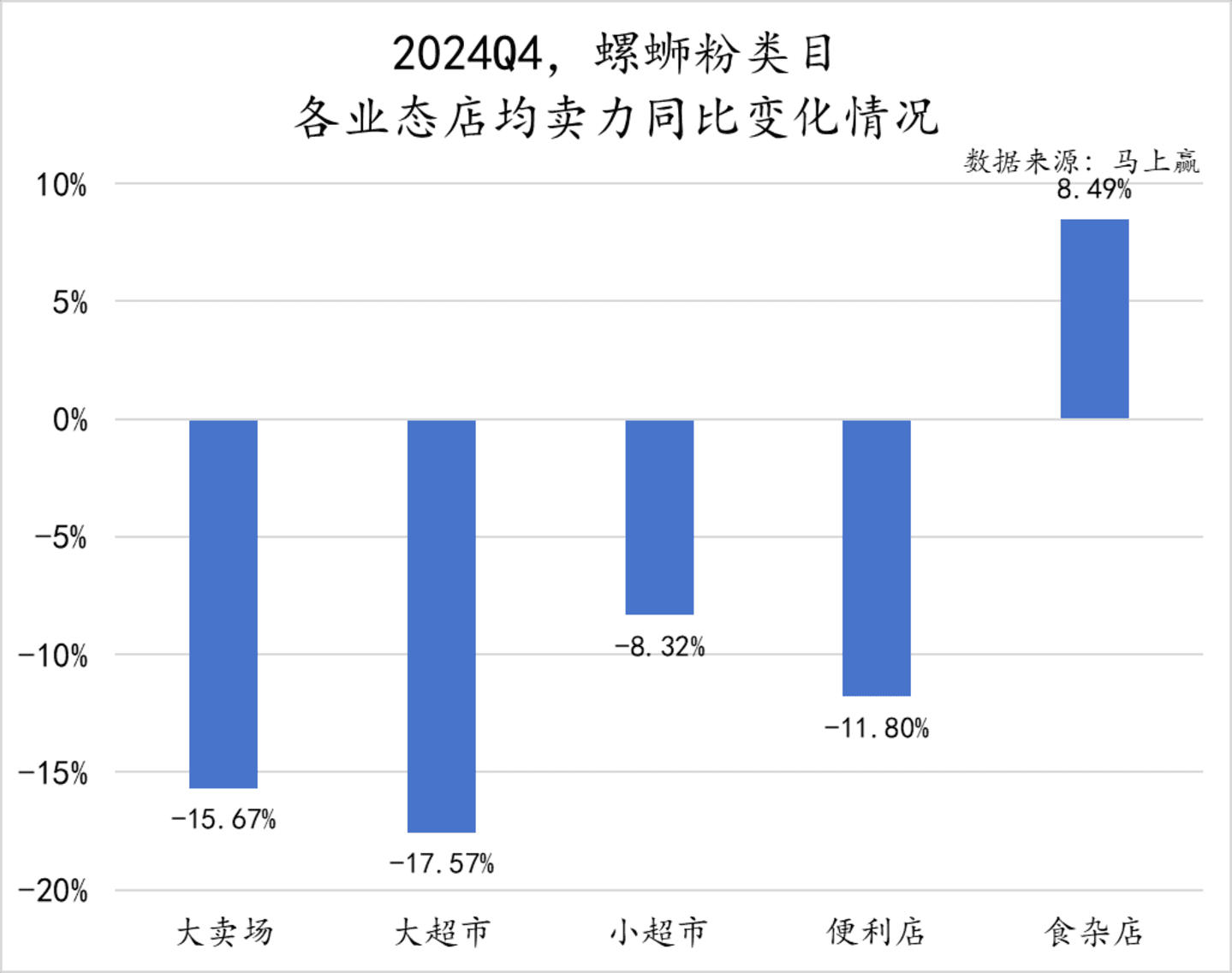 从2024Q4螺蛳粉类目的店均卖力同比变化来看,只有食杂店同比增长8.49%,其余各业态包括大卖场、大超市、小超市和便利店均出现了不同程度的下滑,其中大卖场、大业态的店均卖力同比降幅均超过15%,压力与挑战较大。
