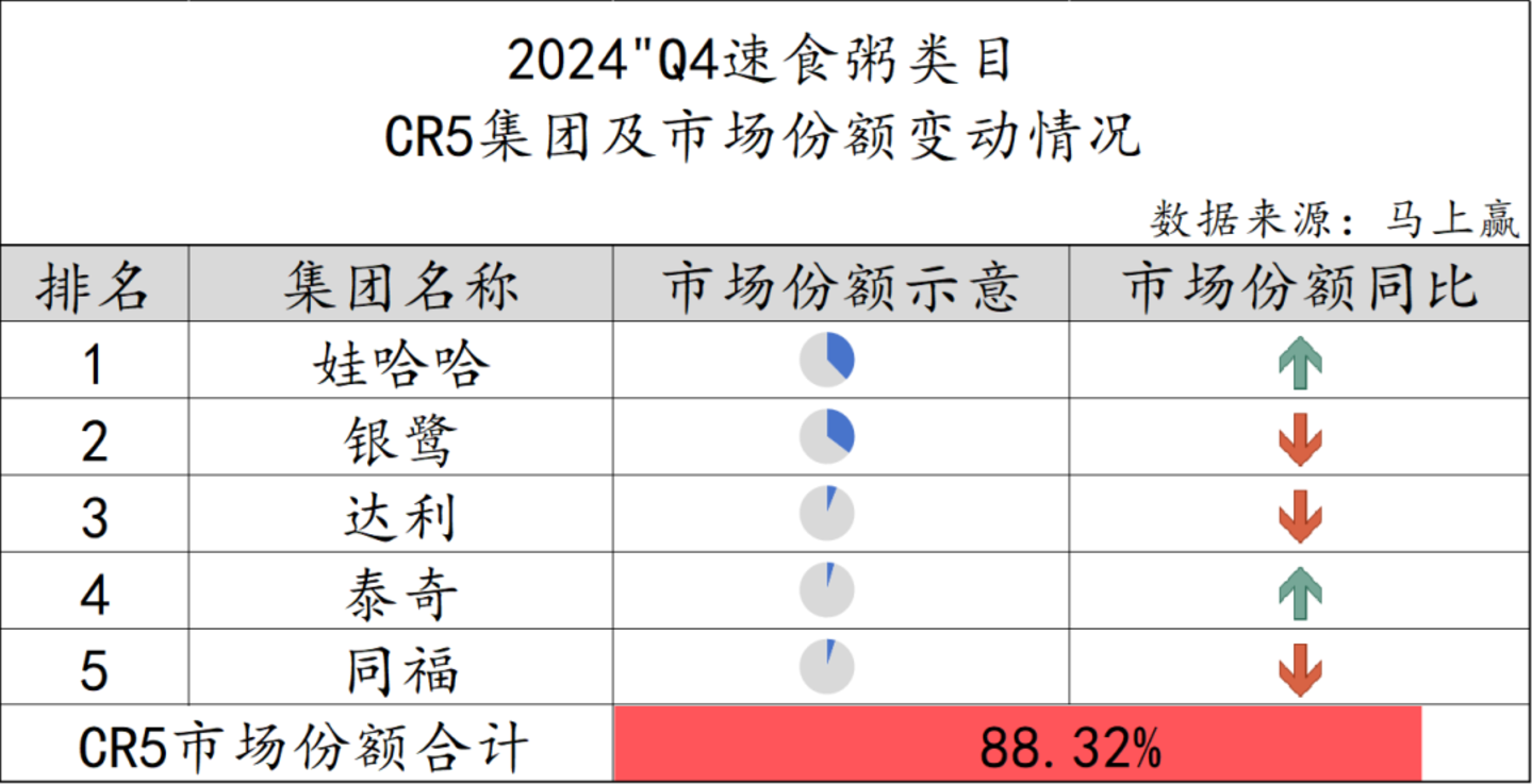 在速食粥市场中,品牌集中度较高,CR5集团的娃哈哈、银鹭、达利、泰奇与同福共同占据了整个速食粥市场88.32%的份额。其中,仅有娃哈哈与泰奇的市场份额有所提升,而银鹭、达利和同福的市场份额则有所下降。