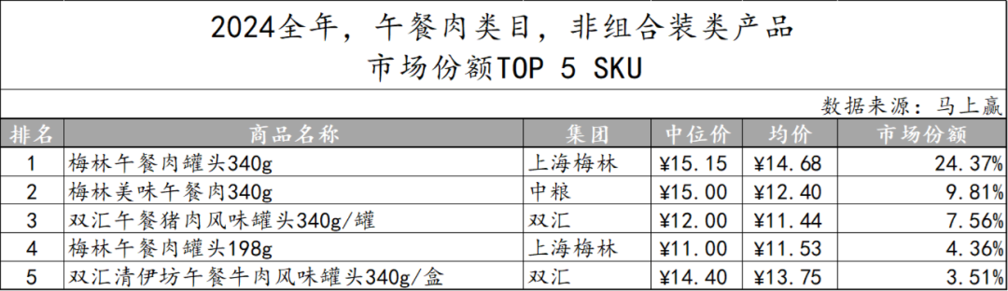 2024年全年,午餐肉类目非组合装产品Top 5 SKU,主要由上海梅林、双汇、中粮三家构成,其中梅林的两款不同规格的午餐肉罐头,承载时代回忆的同时,在今天依然在市场份额上有着较明显的领先优势。