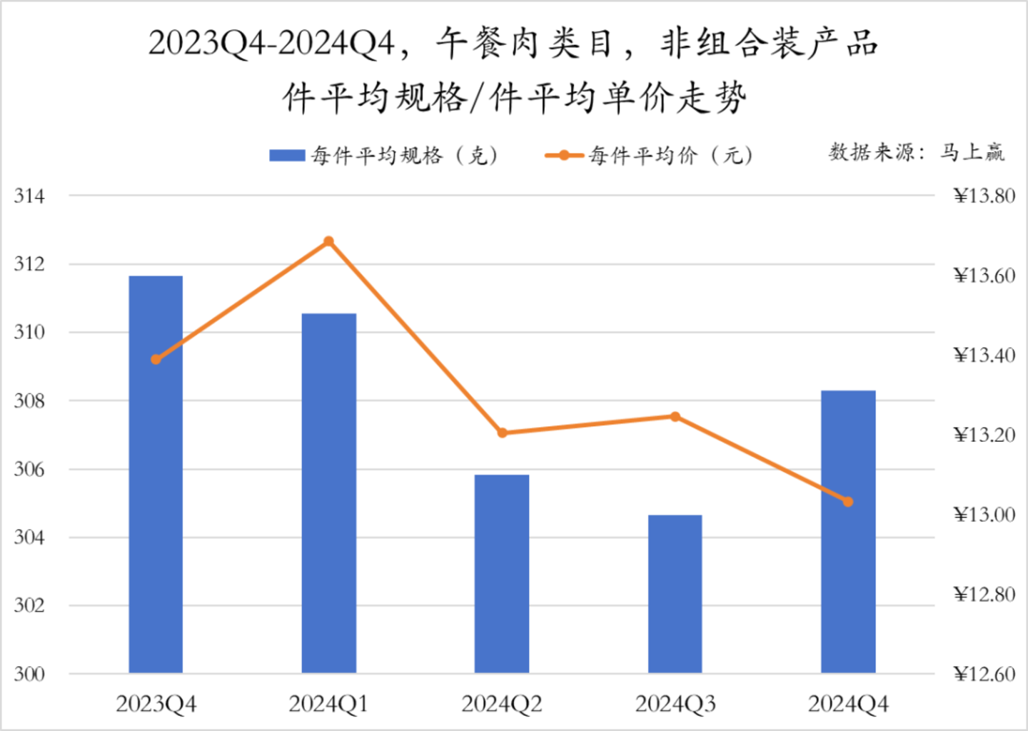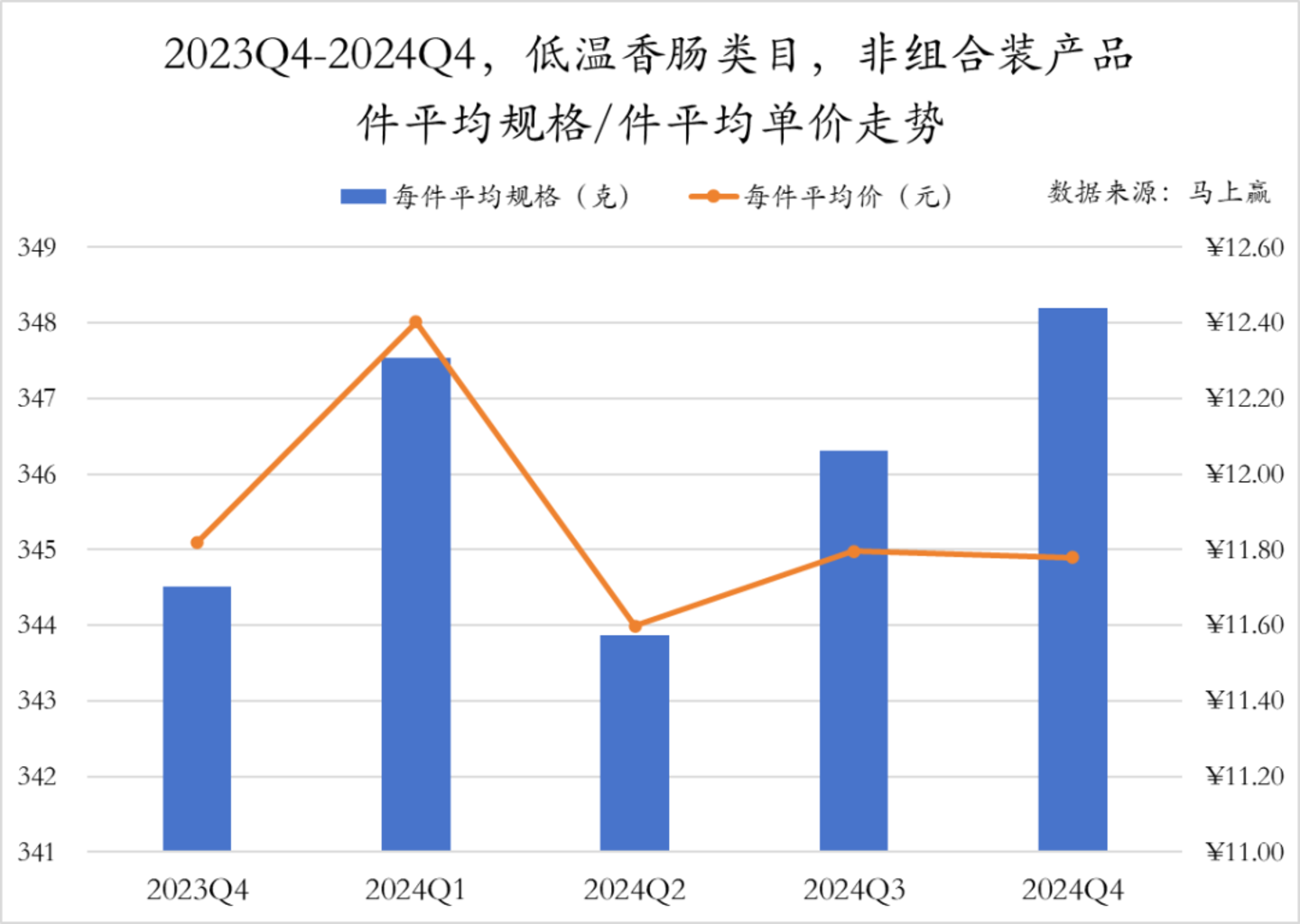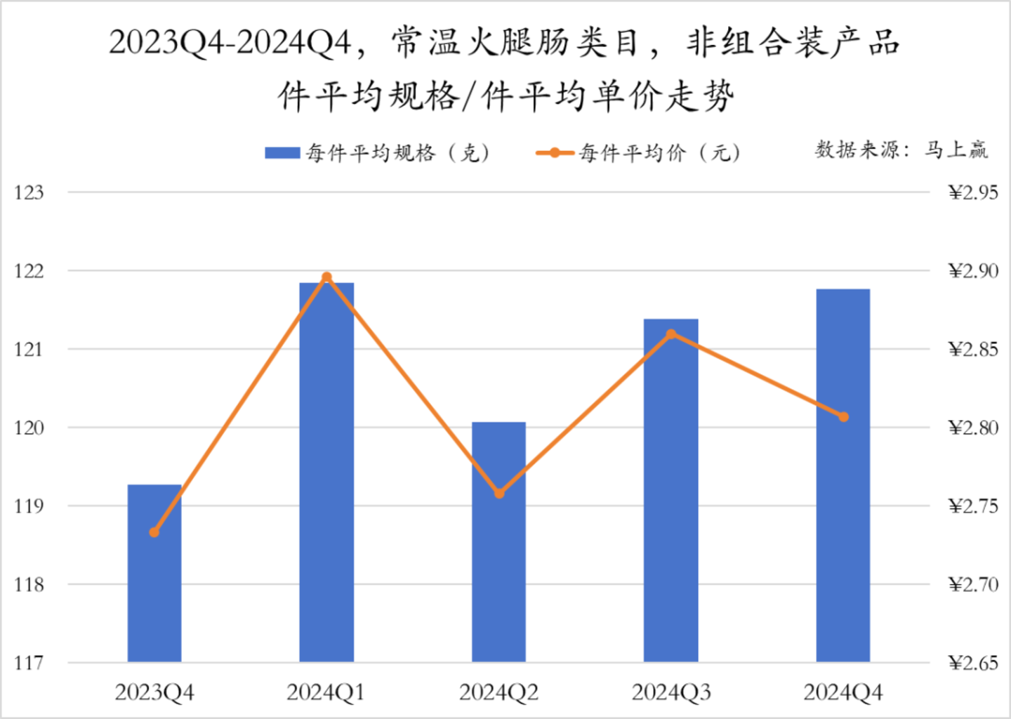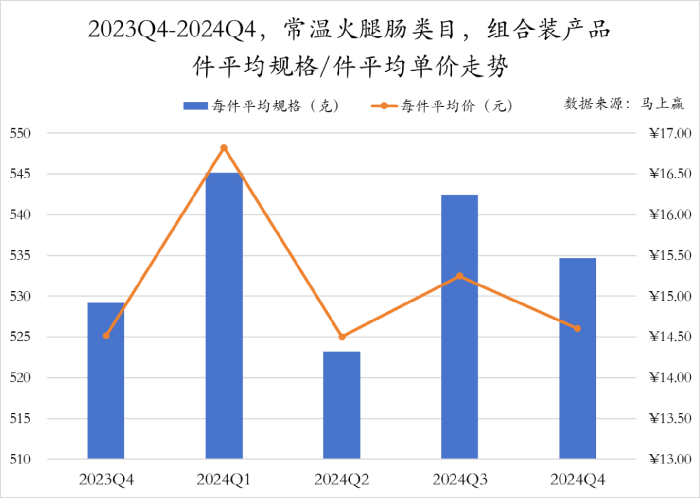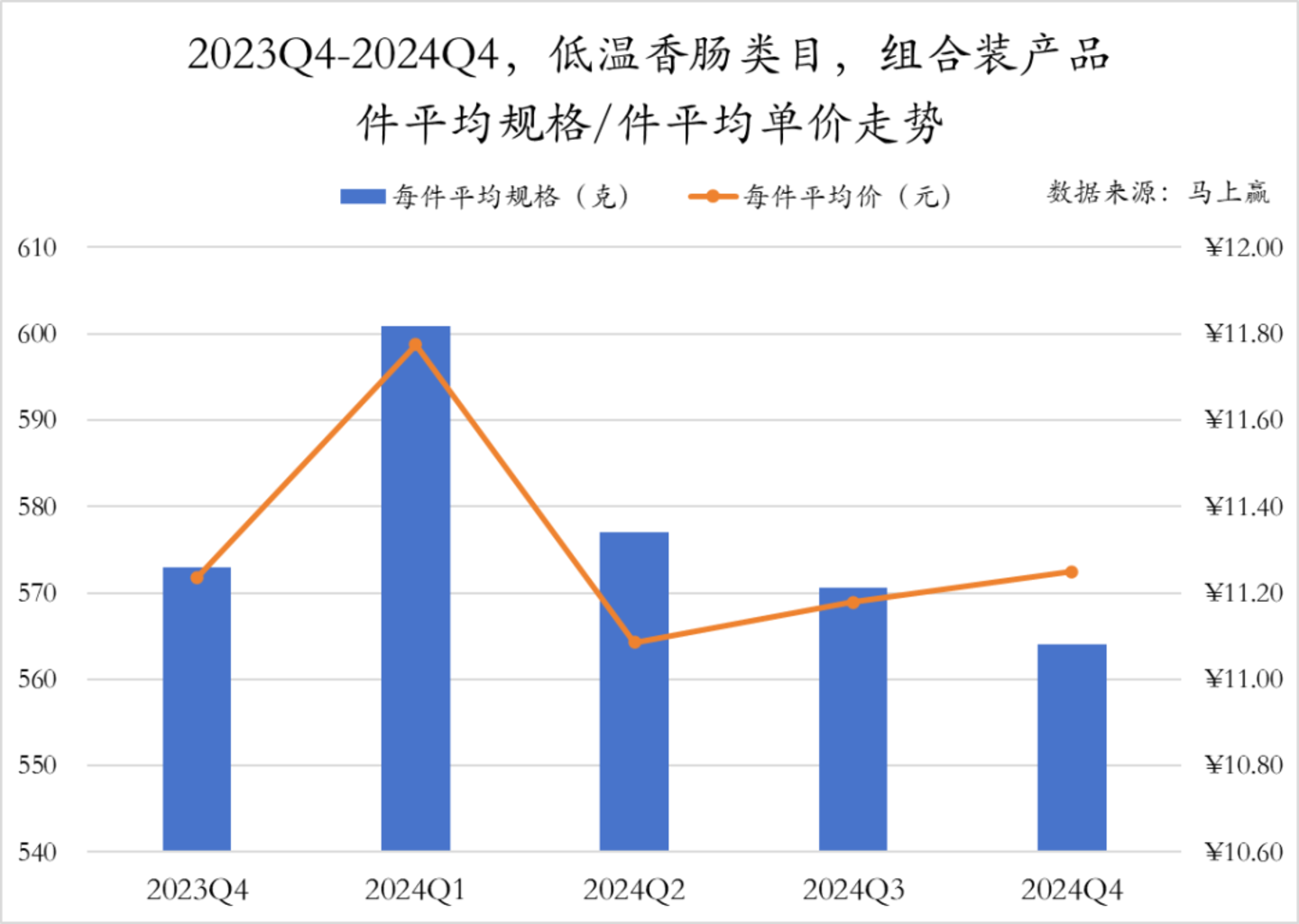 低温香肠类组合装产品的件均价走势与非组合装类似,均是在2024年Q2下跌后有所回升,但二者的件均规格走势差异较大,组合装产品规格从2024年Q2开始连续缩减,2024年Q4缩减至最小规格564g。
