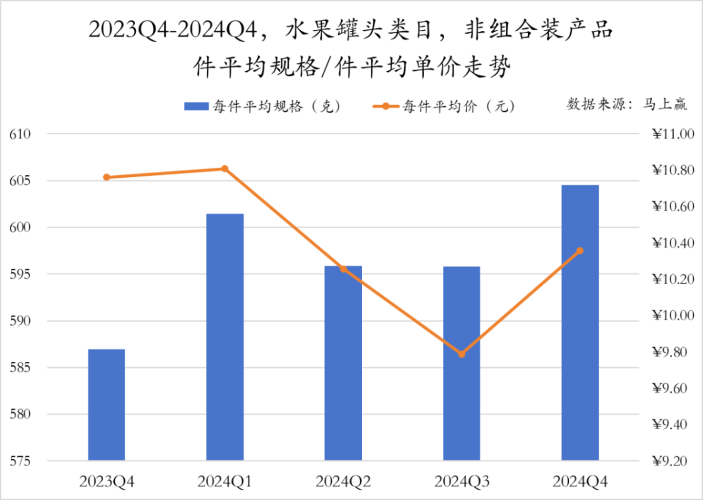 在过去五个季度,水果罐头非组合装产品的件平均规格和件平均单价均经历了波动。件均规格相较于2023年Q4,至2024年Q4提升18g;平均单价则在2024年Q1达到最高点后连续下降,Q4有所回升,水果罐头非组合装产品趋于高性价比。