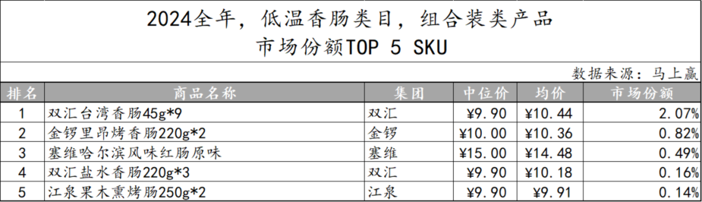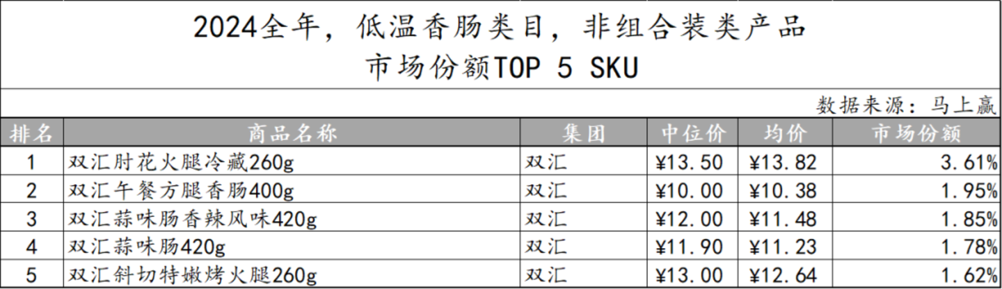 在非组合装产品中,双汇更是一家独大,以各类规格和价格的产品包揽市场份额前五名,显示出品牌的高度集中。