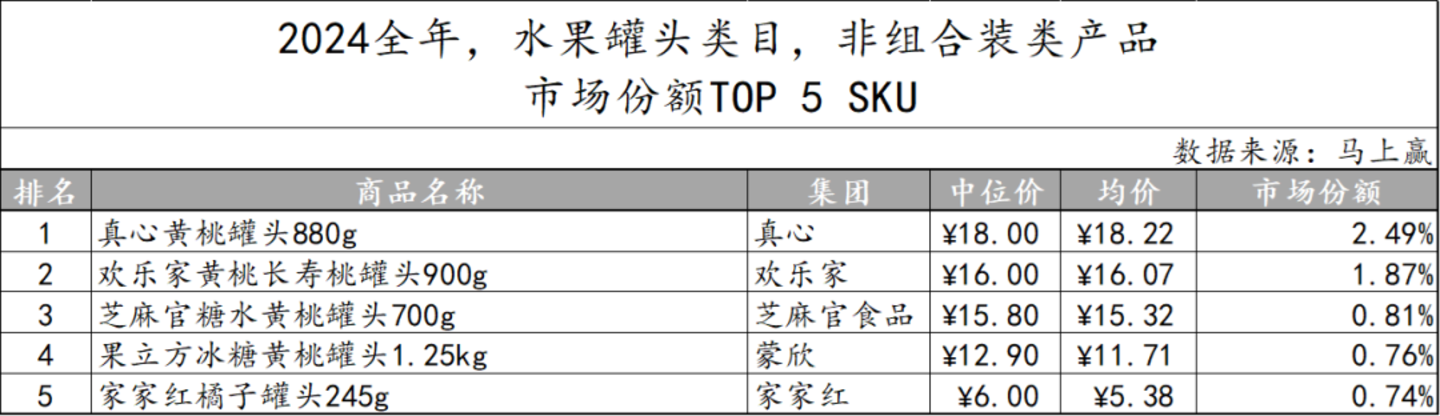 水果罐头类目内的新品TOP 5 SKU同样呈现出多样化特征,但出现最多的产品种类依然是黄桃罐头。集团方面,真心、欢乐家、芝麻官食品、蒙欣和家家红各有一款上榜;产品规格和价格方面,规格从245g到1.25kg不等,价格也有较大差异,满足不同消费者需求。