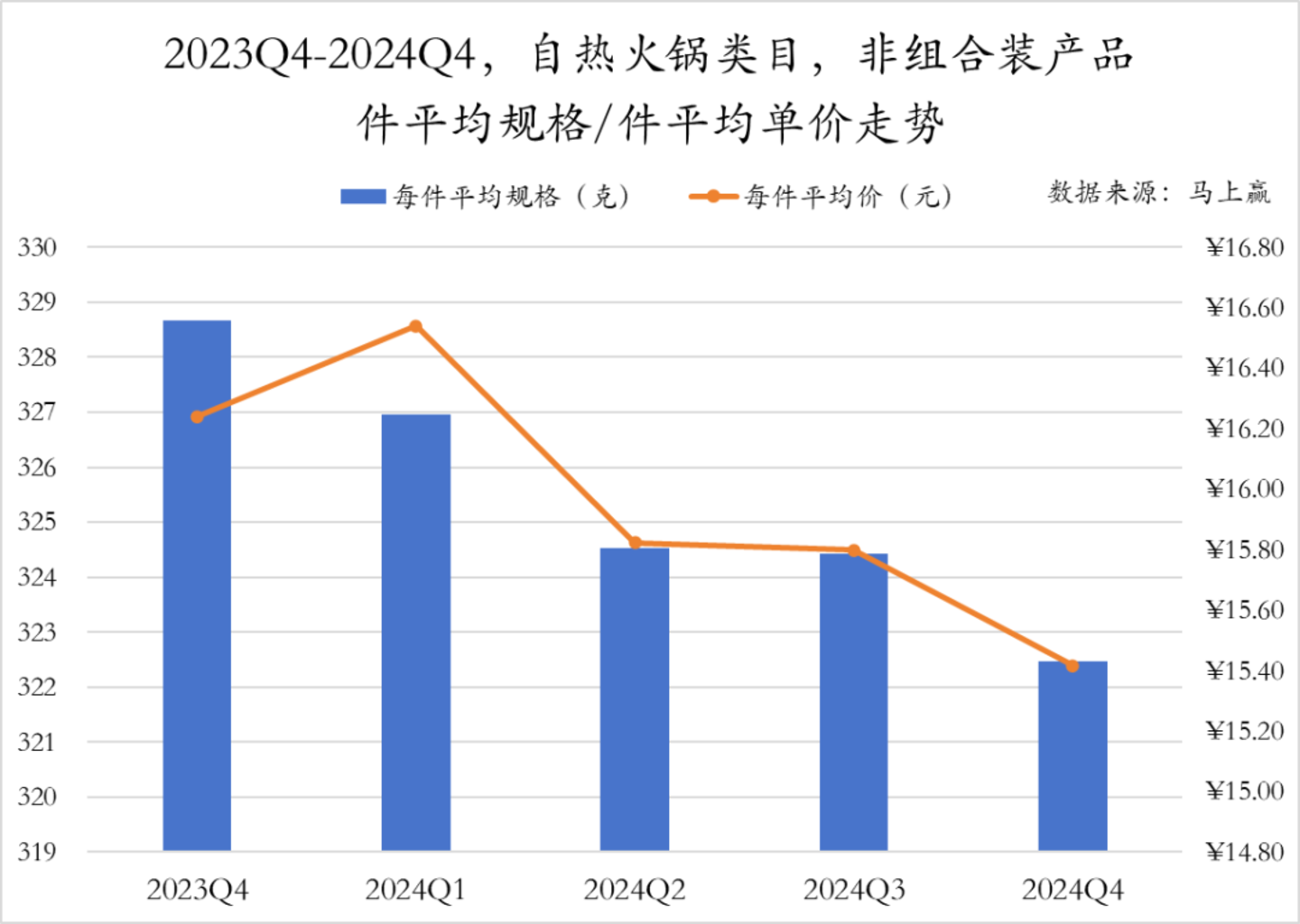 在自热米饭类目中,非组合产品的件平均规格与件平均单价走势也呈现出一定的相似性。2024年Q1件均规格和件均价均达到最高点,此后呈现波动下滑的趋势,2024年Q4规格和均价降到最低值。