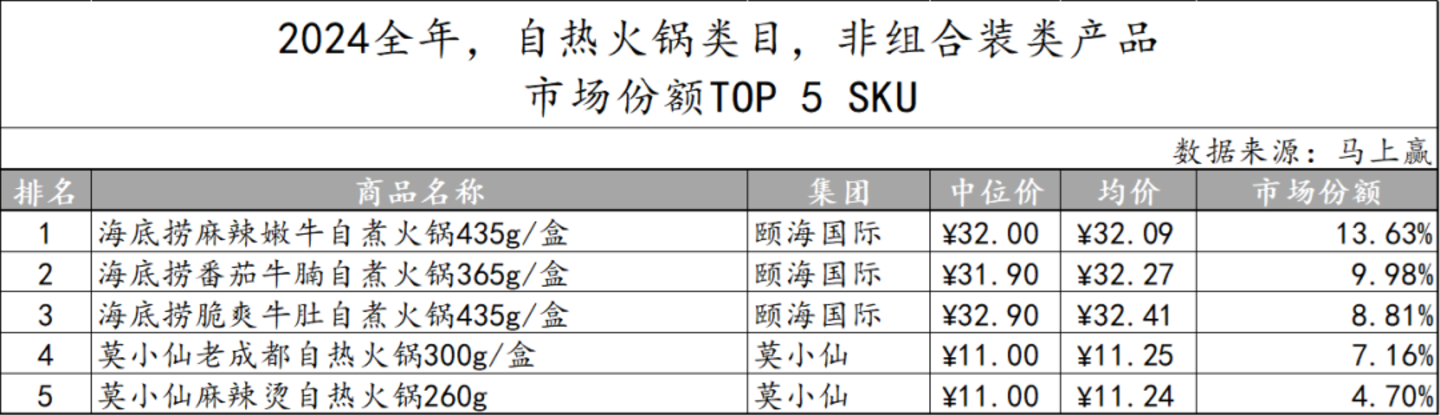 2024年全年自热火锅类目非组合装产品市场份额TOP 5 SKU中,共有颐海国际和莫小仙两个集团的产品上榜,头部集团的影响力显著。同时,上榜产品的市场份额总计超过40%,相比其他类目处于较高集中度水平。