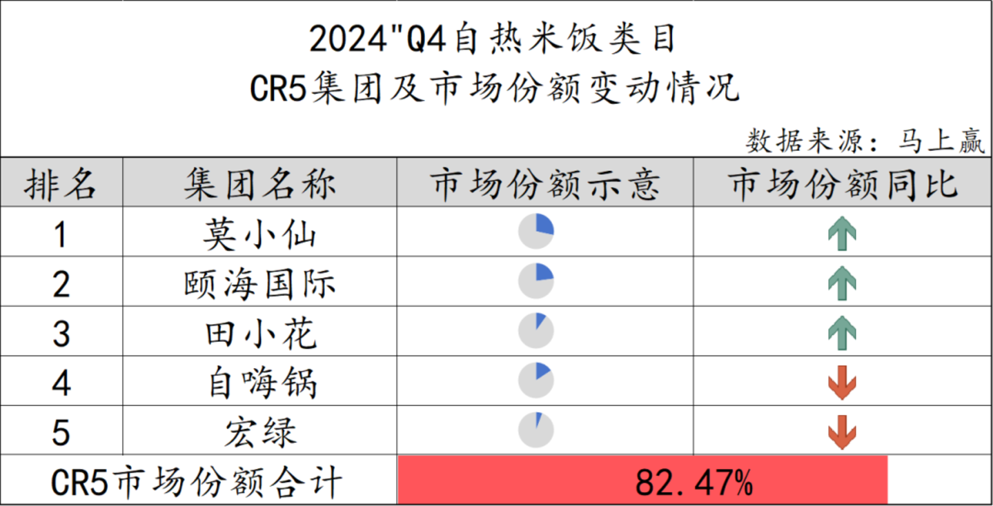 2024Q4,自热火锅类目中,CR5集团的市场份额合计为83.73%,整体集中度较高。各集团市场份额情况上,颐海国际、莫小仙和田小花的市场份额同比有所上升,而自嗨锅、众人火的市场份额则同比下降。