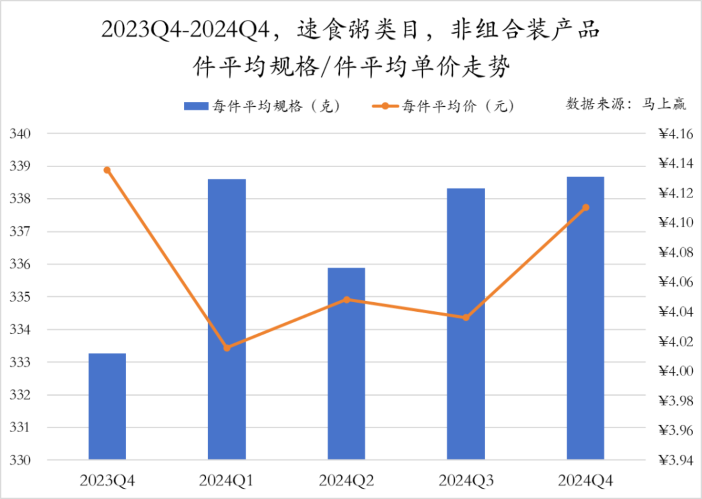 速食粥类非组合装产品在2023年Q4至2024年Q4期间的件均规格与件均单价变化趋势不同。具体来看,件均规格在2024年Q1前后有显著变化,其余均保持相对稳定;件均单价在2023年Q4和2024年Q4较高,其余三个季度小幅度波动。