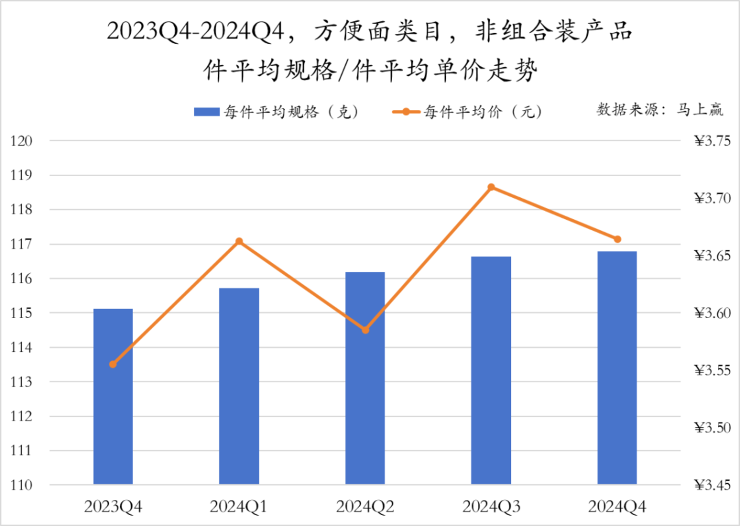 方便面类目中的非组合装产品中,件平均规格和件平均单价总体均呈上升趋势,件平均规格变化幅度较小,同比增长1g左右;件平均单价环比上一季度出现小幅度下降,但同比2023年Q3增长0.1元,整体呈现一定上升趋势,或与成本上涨等有较强的相关性。