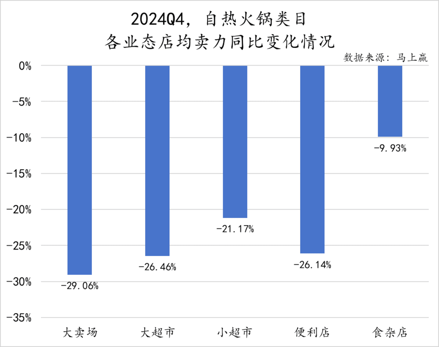 在店均卖力同比变化上,自热火锅类目的表现不容乐观,所有业态店均卖力都有较大程度同比下降。除食杂店外,其余业态的店均卖力同比下降均超过20%,自热火锅各业态均面临较大市场挑战。