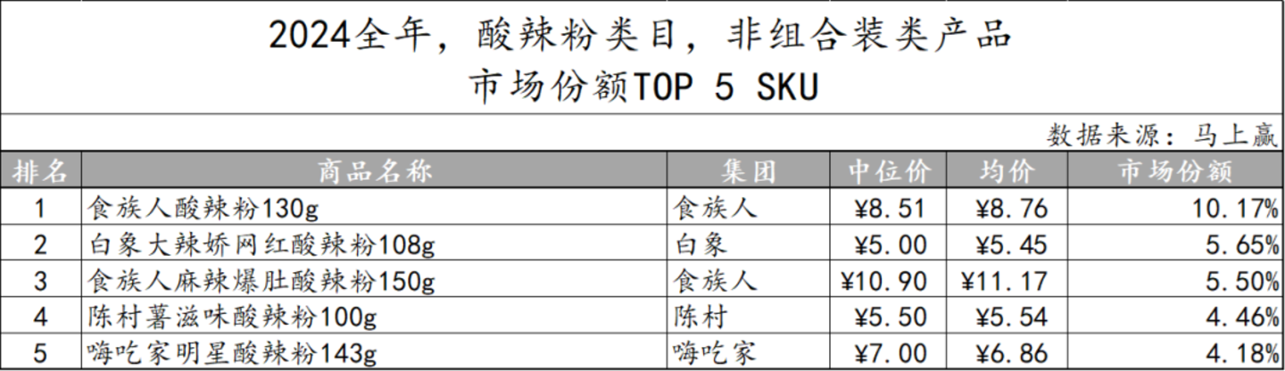 2024年酸辣粉类目非组合装产品中市场份额TOP 5 SKU中,食人族集团有两款产品进入的同时,”食人族酸辣粉130g“这一产品更是占据市场份额的10.17%,相比之下,CR5集团之外的嗨吃家集团,其产品则以较大规格、较低均价的特点跻身第五位。