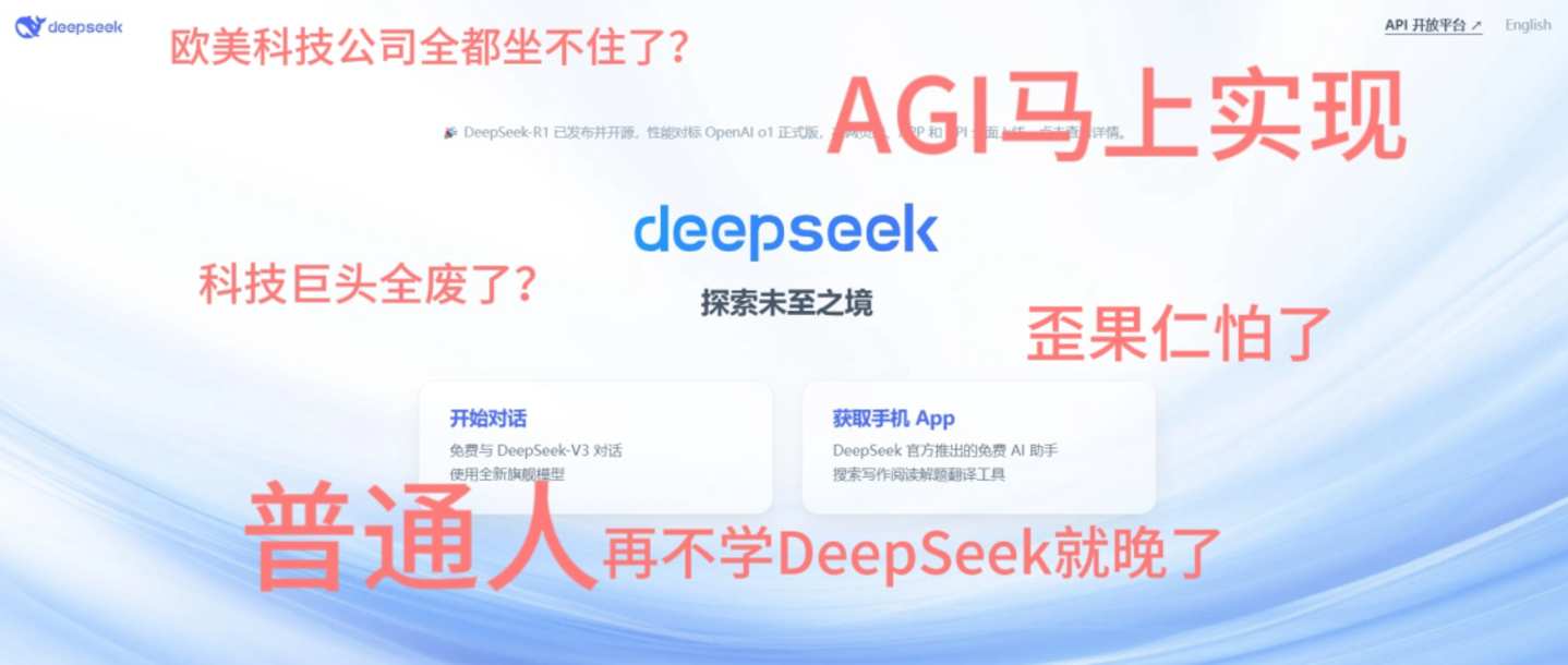 接下来这种“热情”愈演愈烈。什么“科技巨头全报废了”“AGI马上实现”“普通人再不学DeepSeek就晚了”,种种言论层出不穷。甚至还有DeepSeek受到境外大规模网络攻击,各大科技公司顶尖高手联手隐迹江湖的中国红客出手相救的爽文剧情。
