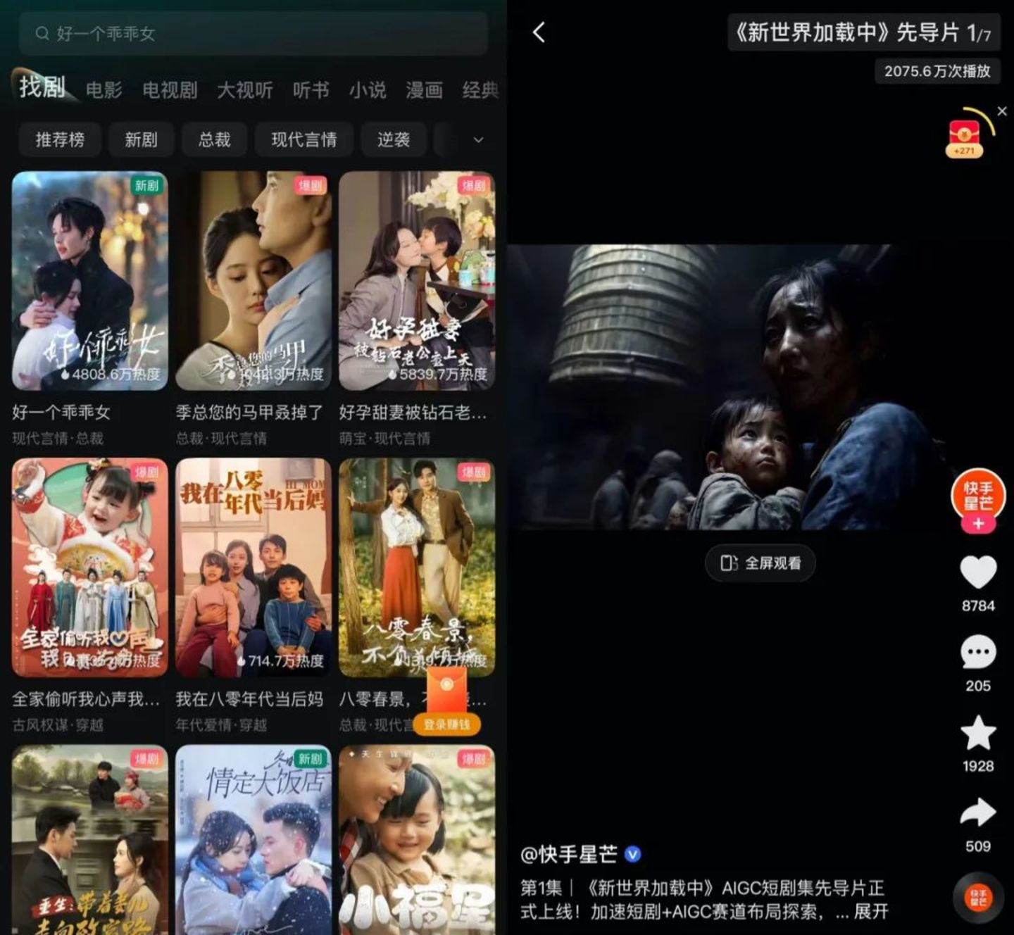 快手在春节档重新选择了更贴近下沉市场的短剧内容,并且发布了首部AI单元剧集《新世界加载中》先导片,尝试在服务平台短剧用户大盘的基础上试水AIGC的价值。