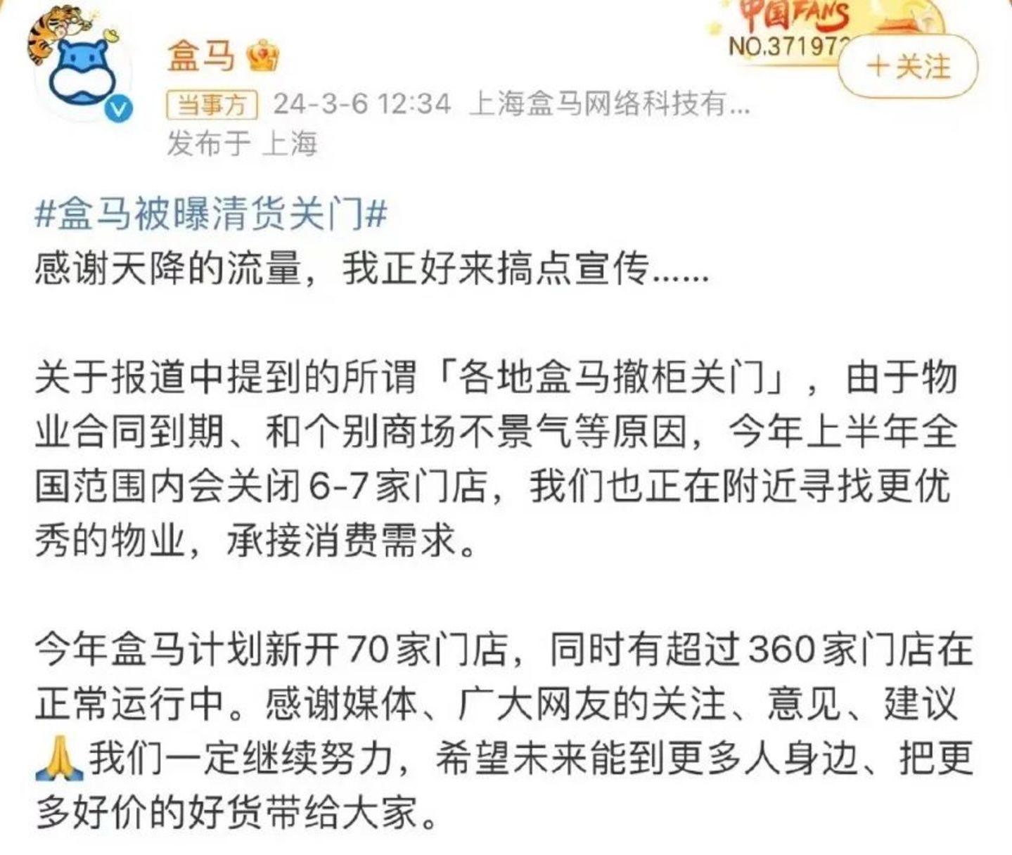 一个明显的现象是,2024年上半年,盒马鲜生陆续关闭6-7家门店,沈阳、海南等地已经“查无此马”。官方给出的原因为:物业到期和商场不景气等。