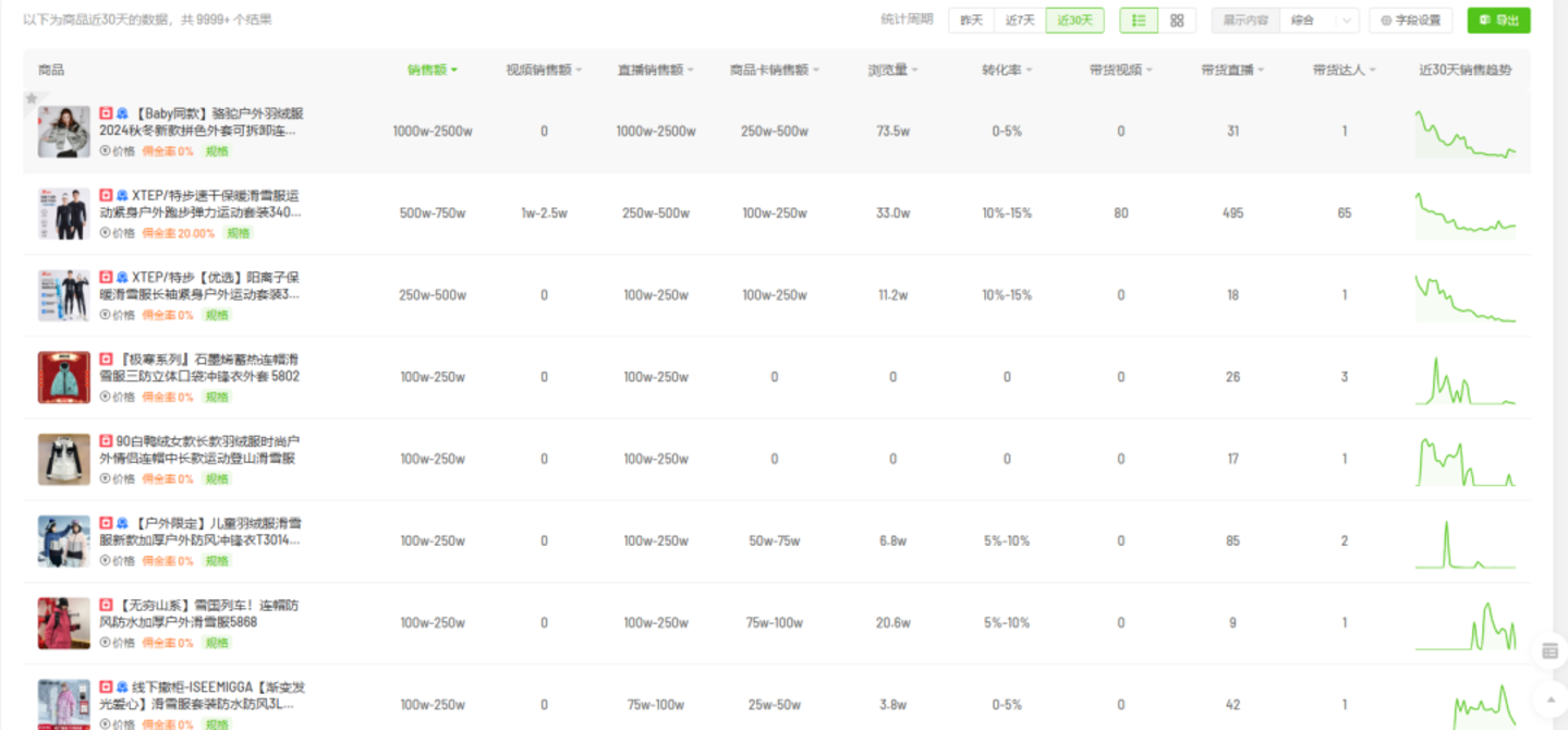滑雪服同样成为近两年大量服装企业博弈的新战场,阿迪推出和冠军选手苏翊鸣共创的单板滑雪服;ZARA上线30款滑雪服,内衣品牌猫人推出多款滑雪速干衣装备。抖音平台和滑雪服相关的商品高达9999+,骆驼旗下某款滑雪服2024年双11大促期间GMV为5000万-7500万。2022年创牌、2023年入驻天猫的雪服品牌ISSE MIGGA,2024年年销售额增长400%。