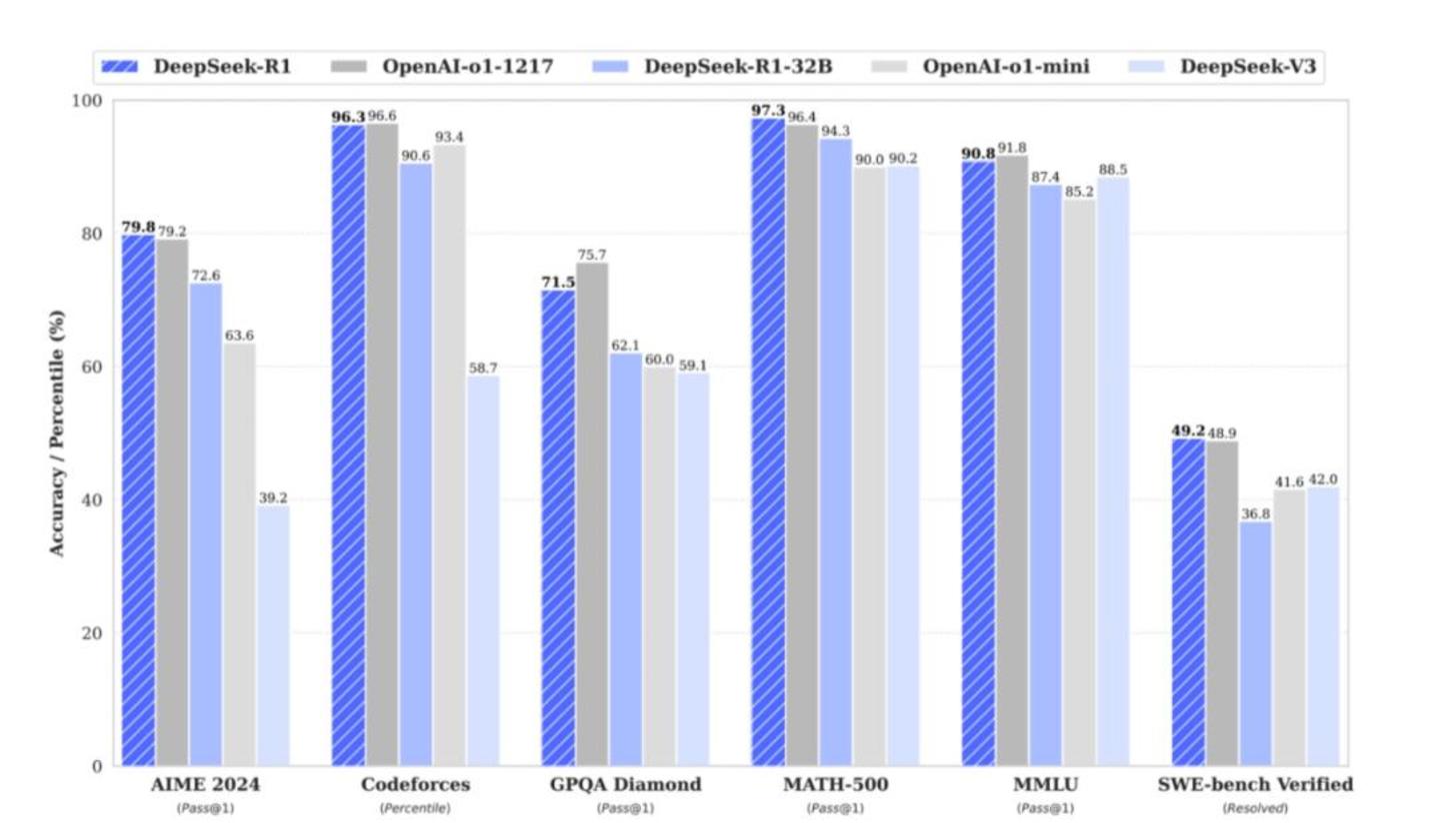 在DeepSeek发表的论文中,一组数据显示DeepSeek-R1 在 AIME 2024 测试中取得了 79.8% 的 Pass@1 得分,略⾼于 OpenAI-o1-1217。在 MATH-500 上,其得分达到了 97.3%,表现与 OpenAI-o1-1217 相当,并显著优于其他模型。