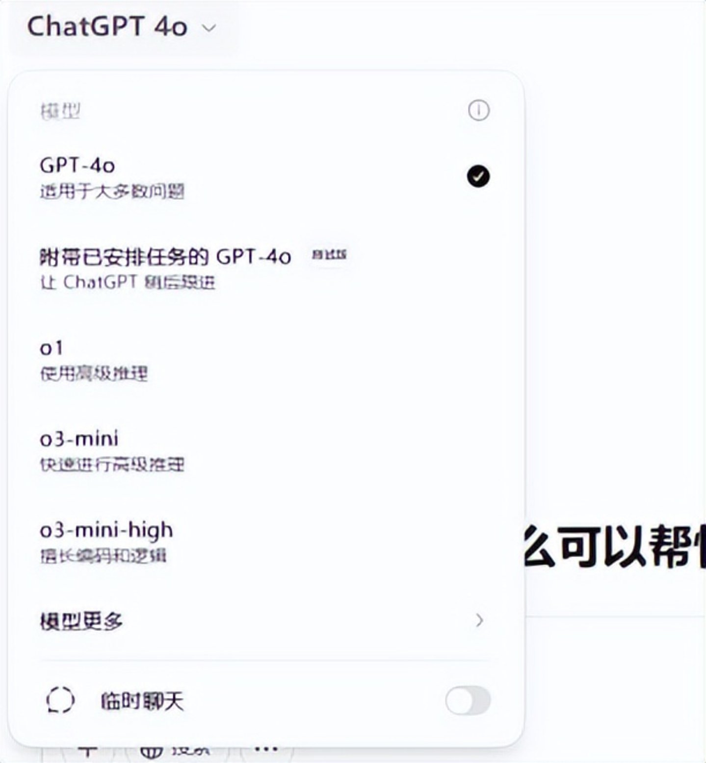 比如Plus用户点开下拉菜单,会看到一串可选择的模型:GPT-4o、附带已安排任务的GPT-4o、o1、o3-mini、o3-mini-high,它们分别适用于大多数问题、可以让ChatGPT稍后跟进、使用高级推理、快速进行高级推理、擅长编码和逻辑。