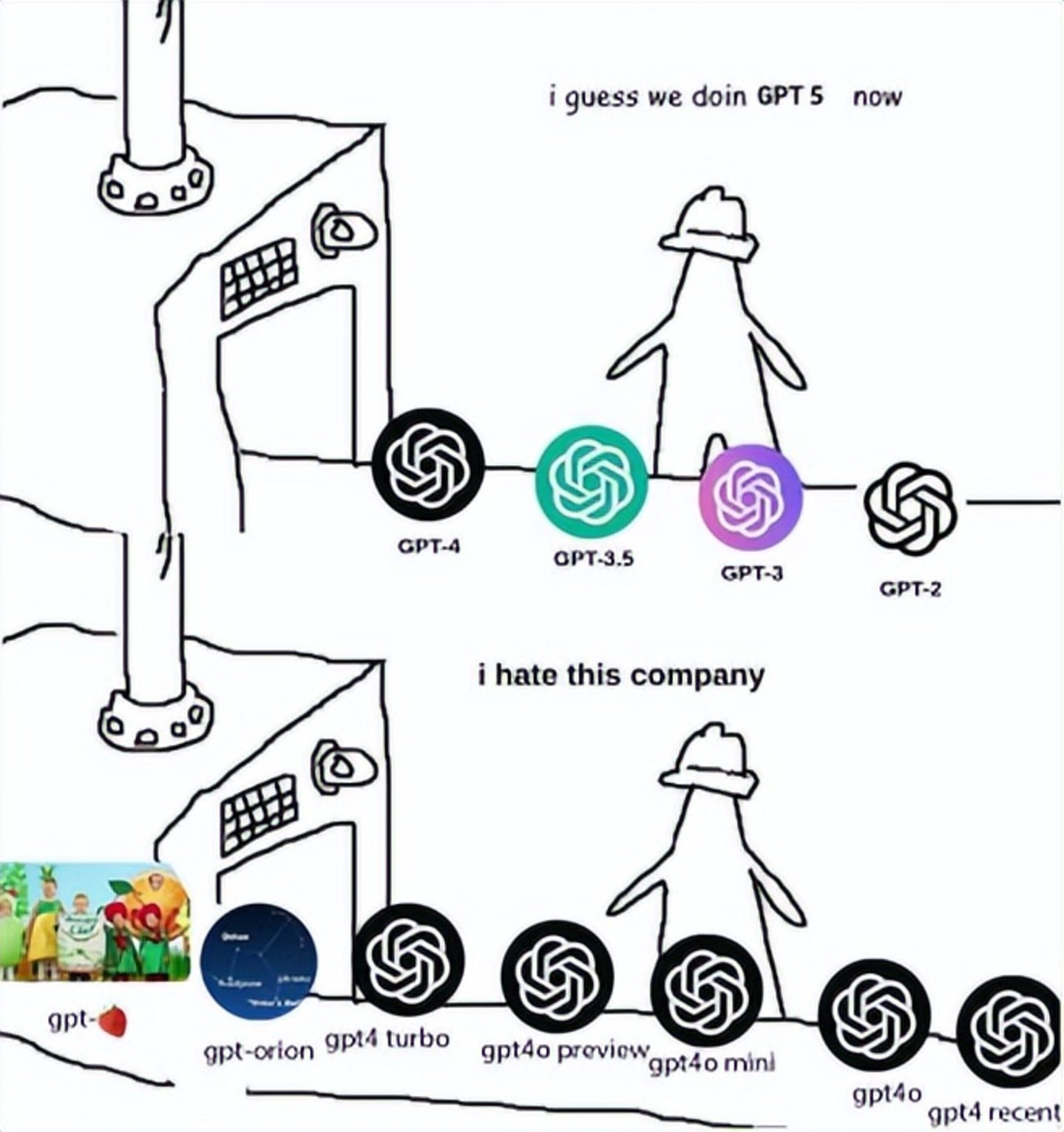 这个问题也不只是OpenAI有,谷歌的模型命名也是灾难。早在去年初,就有报道称谷歌员工自己在内网吐槽公司的AI命名问题,还制作了“令人红温”的梗图。彼时谷歌发布了Gemini模型的Nano、Pro、Ultra版本,将Bard改名Gemini,并且还发布了名为Goose和Gemma的模型。