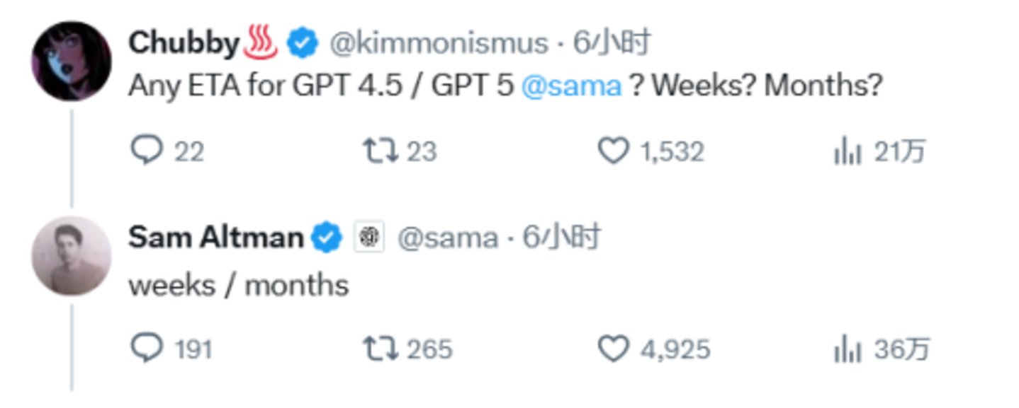 其实发帖交代计划这件事本身,就没怎么见奥特曼做过。甚至在评论区,有人问到GPT-4.5和GPT-5到底什么时候发布,奥特曼也没有回避,而是回复称前者几周内,后者数月内发布。