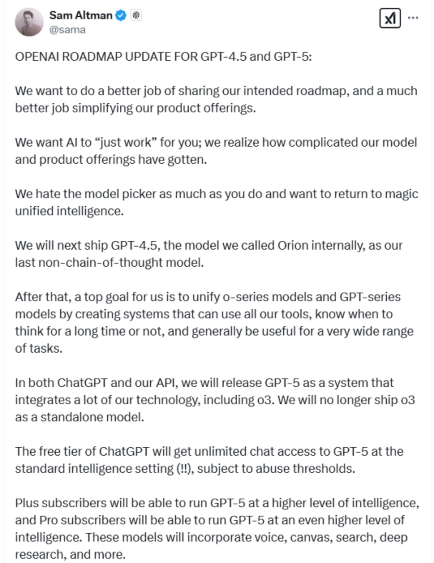 OpenAI的CEO山姆·奥特曼(Sam Altman)突然在X上发帖,给大家同步产品计划。